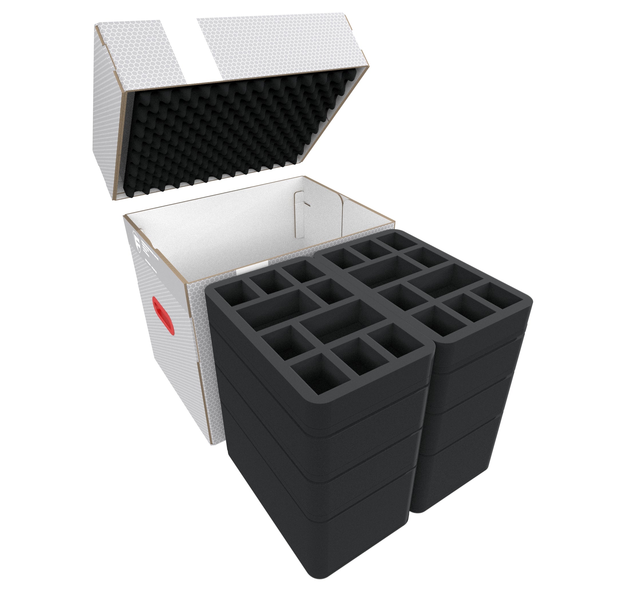The matching convoluted foam topper made of sturdy convoluted foam completes the set. Nothing can fall out during transport, and the miniatures in the uppermost rays are also well protected.