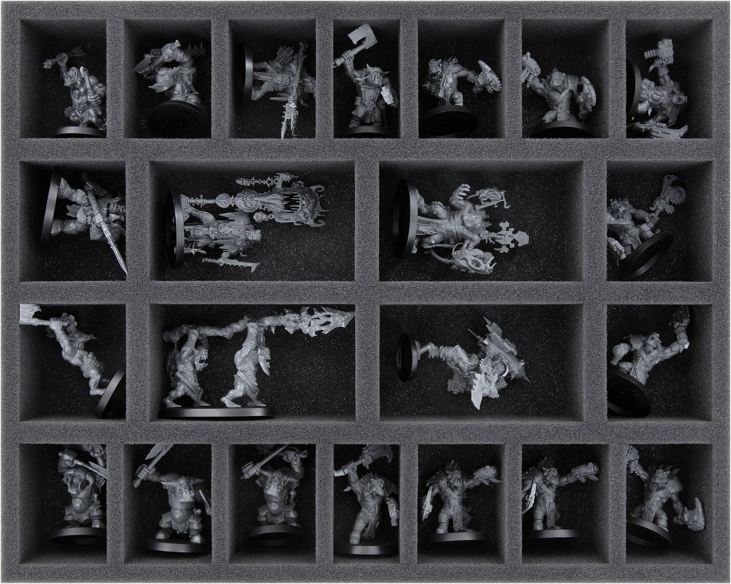 This Storage Box FSLB310, filled with matching Feldherr foam trays, provides space for all 40 miniatures from the Orks: Battleforce – Killdakka WarbandSet by GamesWorkshop.