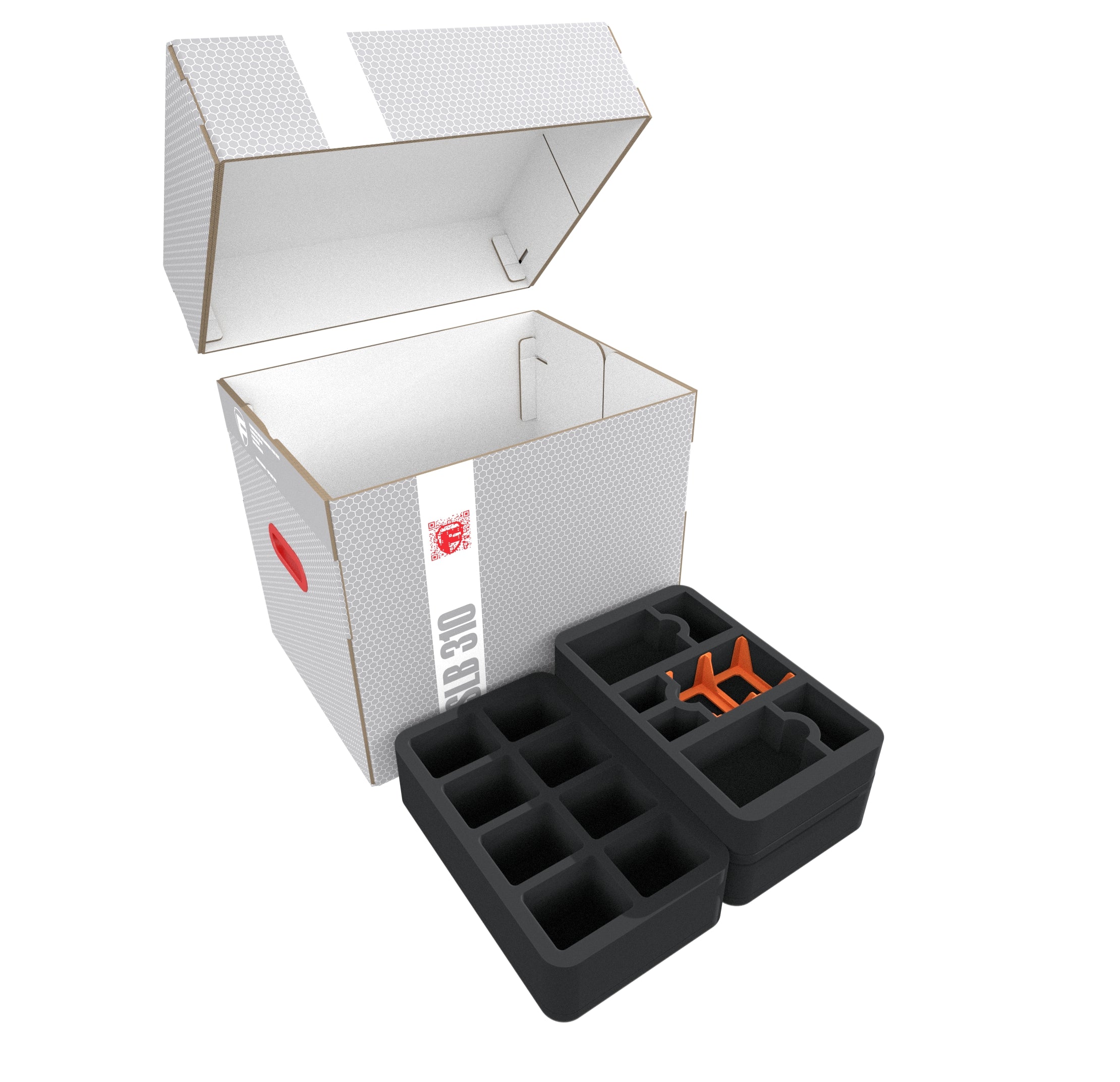 The Storage Box FSLB310 is made of coated, double-walled cardboard. This makes it not only pleasantly light, but also very tear-resistant and stable. The attachable lid reliably protects the contents from dust and other external influences. With the appropriate foam trays, miniatures, game material and all other goods can be stored safely - and conveniently transported with the two plastic-reinforced carrying handles on the sides.