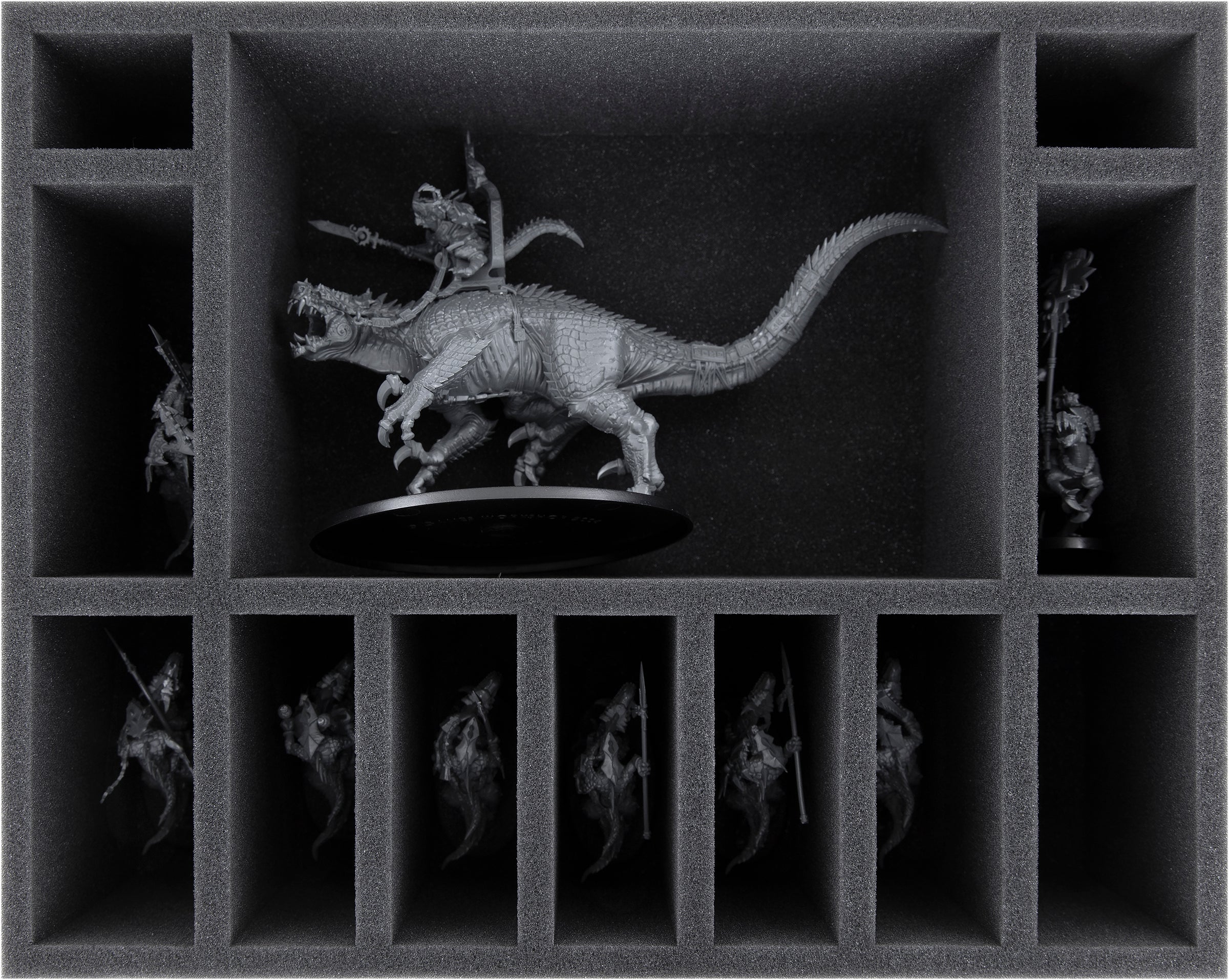 - 1 Full-Size foam tray with 12 compartments for e.g. Saurus Oldblood on Carnosaur, Saurus Knights, Saurus Warriors (FSMFCA105BO)