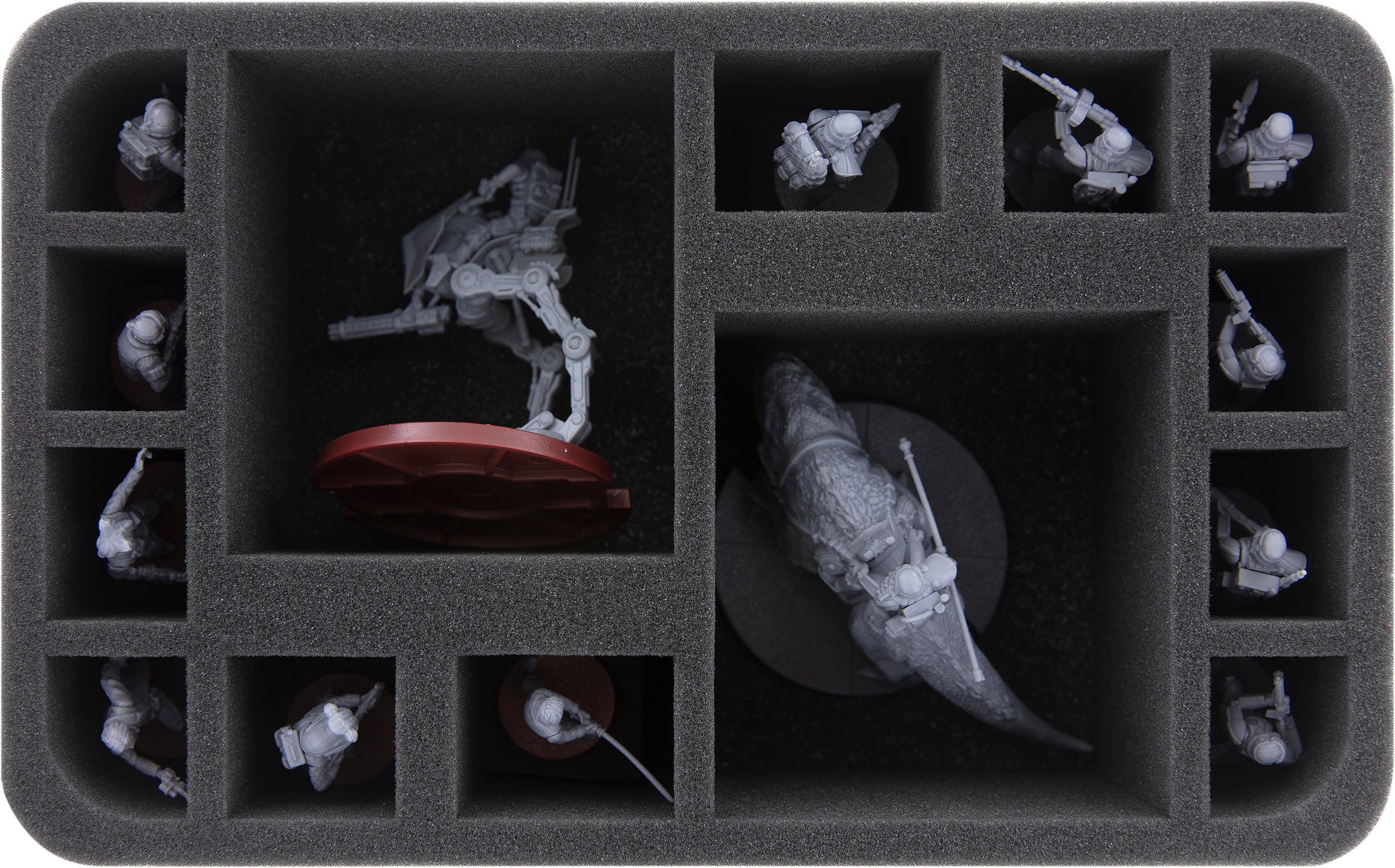 With the HS085A004 insert, up to 14 Star Wars: Legion miniatures can be neatly and securely stowed away. The two large compartments are ideal for the Dewback Riders and other similarly large figures. The remaining 12 compartments can be filled with infantry models, or used to store e.g. tokens or dice.
