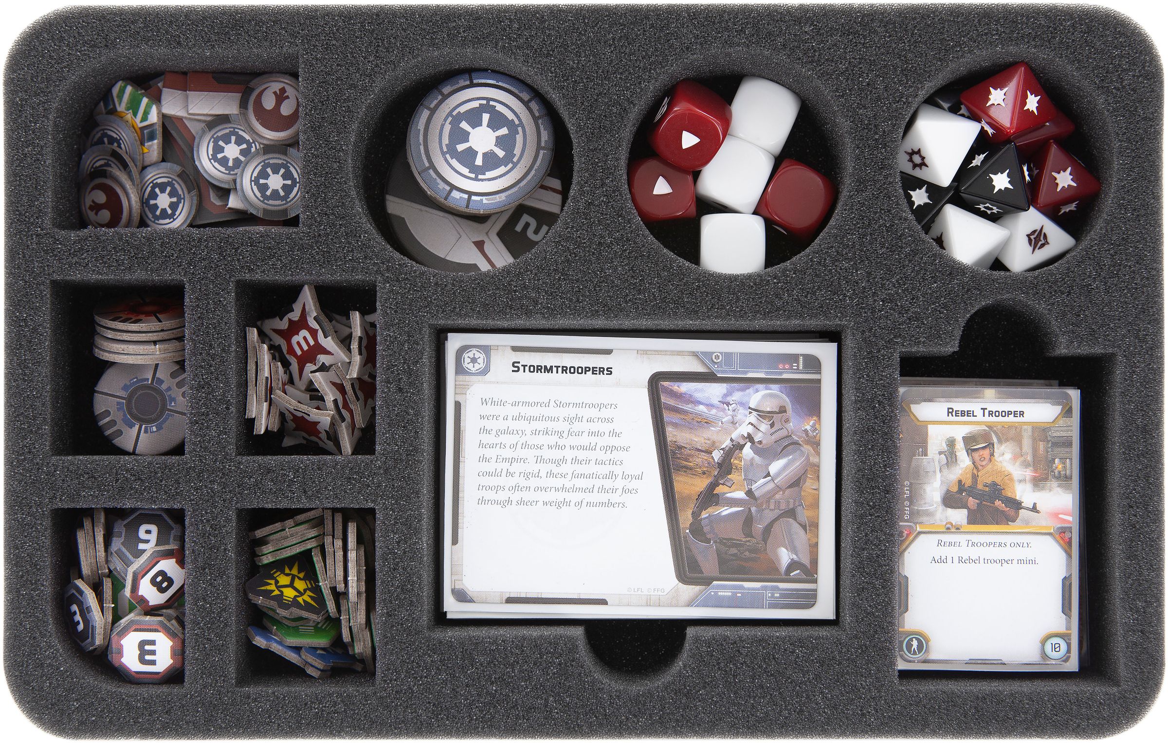 HSFW045BO: This insert has 10 compartments for accessories. One compartment will hold small cards, one compartment is suitable for large cards. Three round and five rectangular compartments will hold tokens and dice..