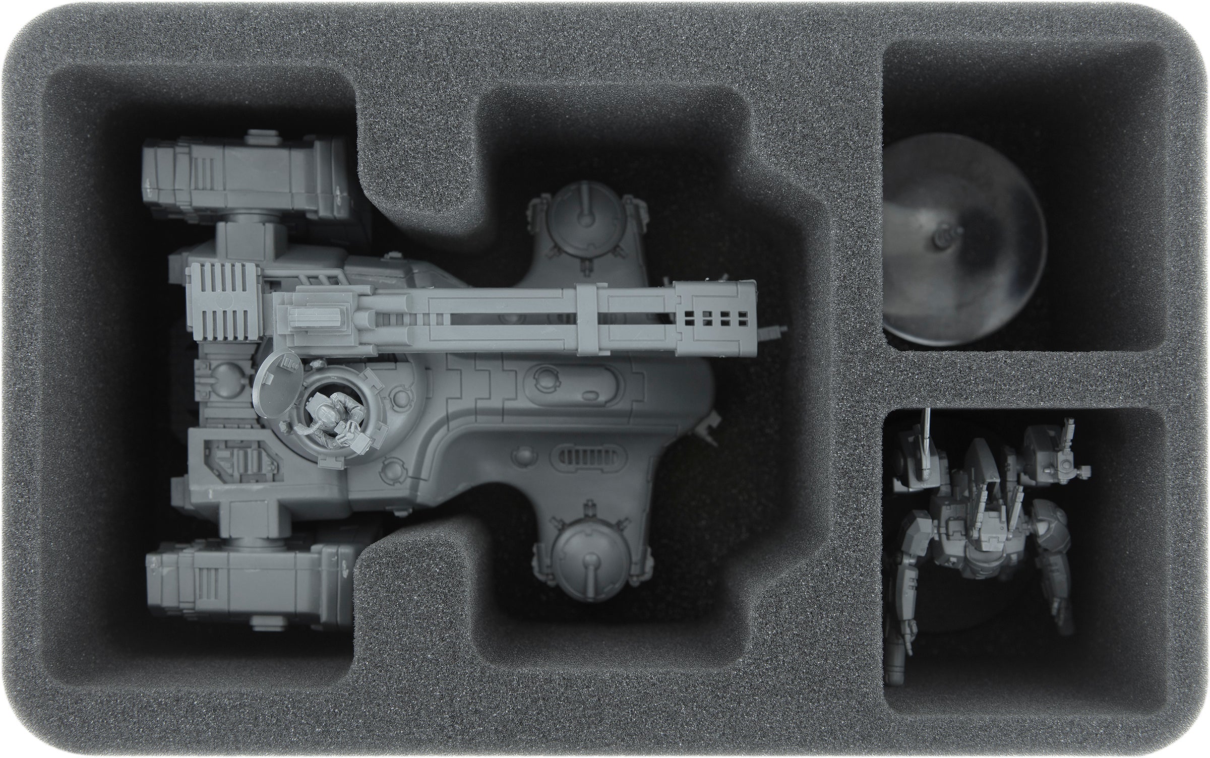 One Half-Size tray is custom made for one model of the Hammerhead Gunship. The MV1 Gun Drones and the vectored engines remain intact during transport, as does the massive ion cannon. Embedded in high-quality, soft foam, the colors and transfer pictures of the painted miniature are also safe from abrasion and scratches.