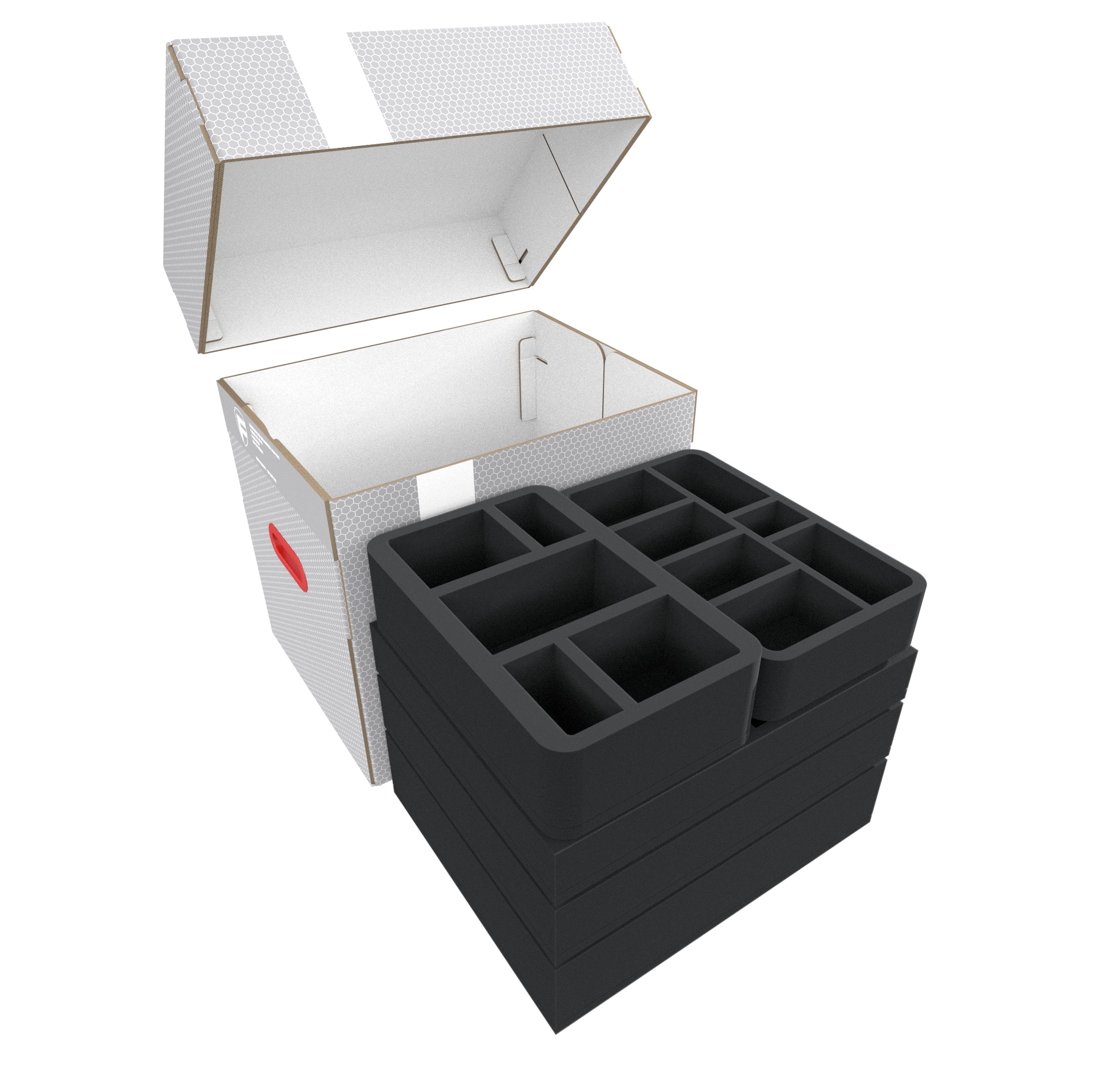 The Storage Box FSLB310 is made of coated, double-walled cardboard. This makes it not only pleasantly light but also very tear-resistant and stable. The attachable lid reliably protects the contents from dust and other external influences. With the appropriate foam trays, miniatures, game material, and all other goods can be stored safely - and conveniently transported with the two plastic-reinforced carrying handles on the sides.