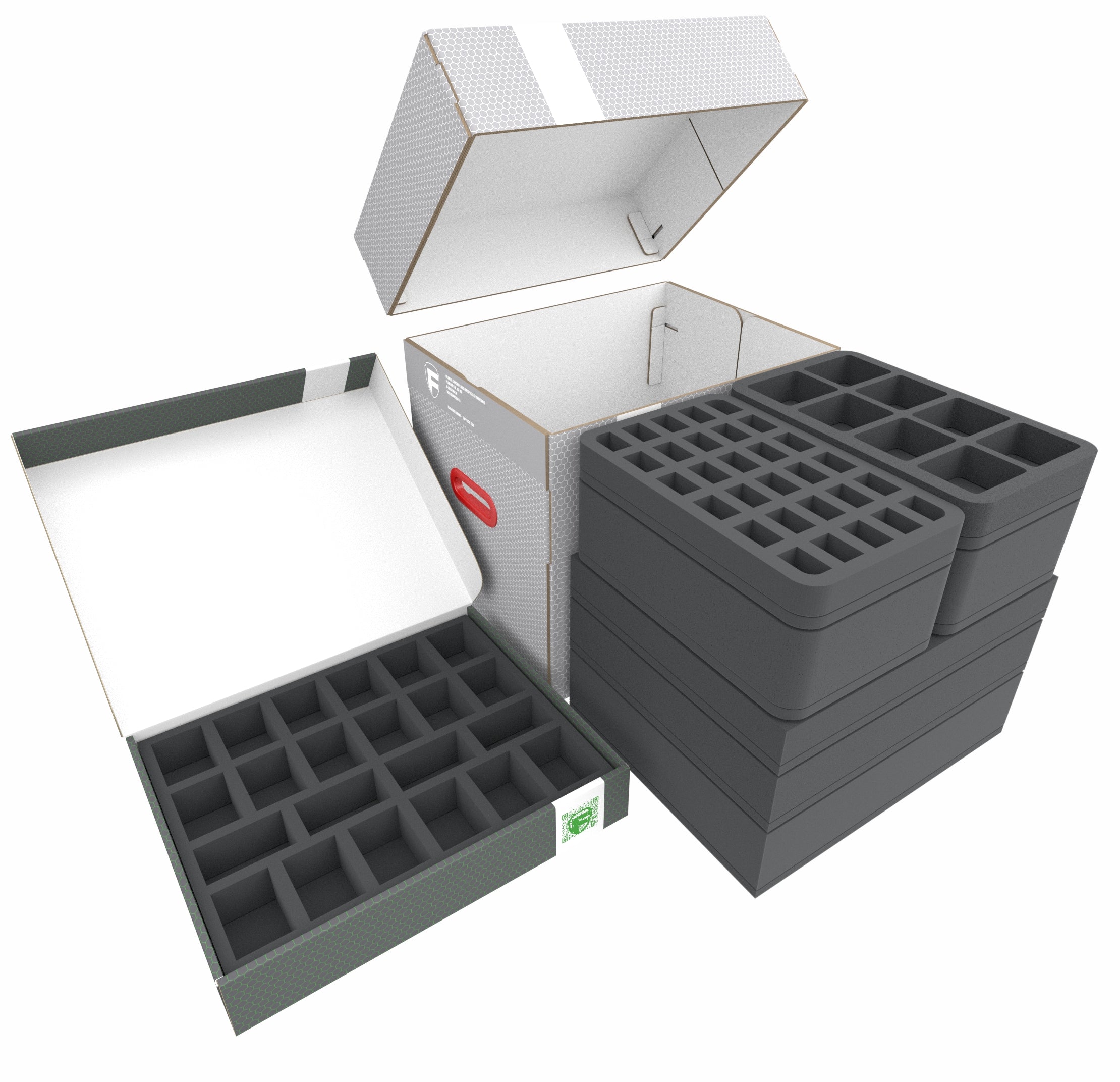 The Storage boxes FSLB310 and FSLB055 + Organizer Insert, filled with premium Feldherr foam trays, cardholders and tokentrays, ensure that all 86 miniatures, game cards, dice and tokens are securely protected. Instead of juggling multiple boxes at once, you’ll only need two hands to transport this Storage box set, ensuring your miniatures arrive at the battlefield intact.