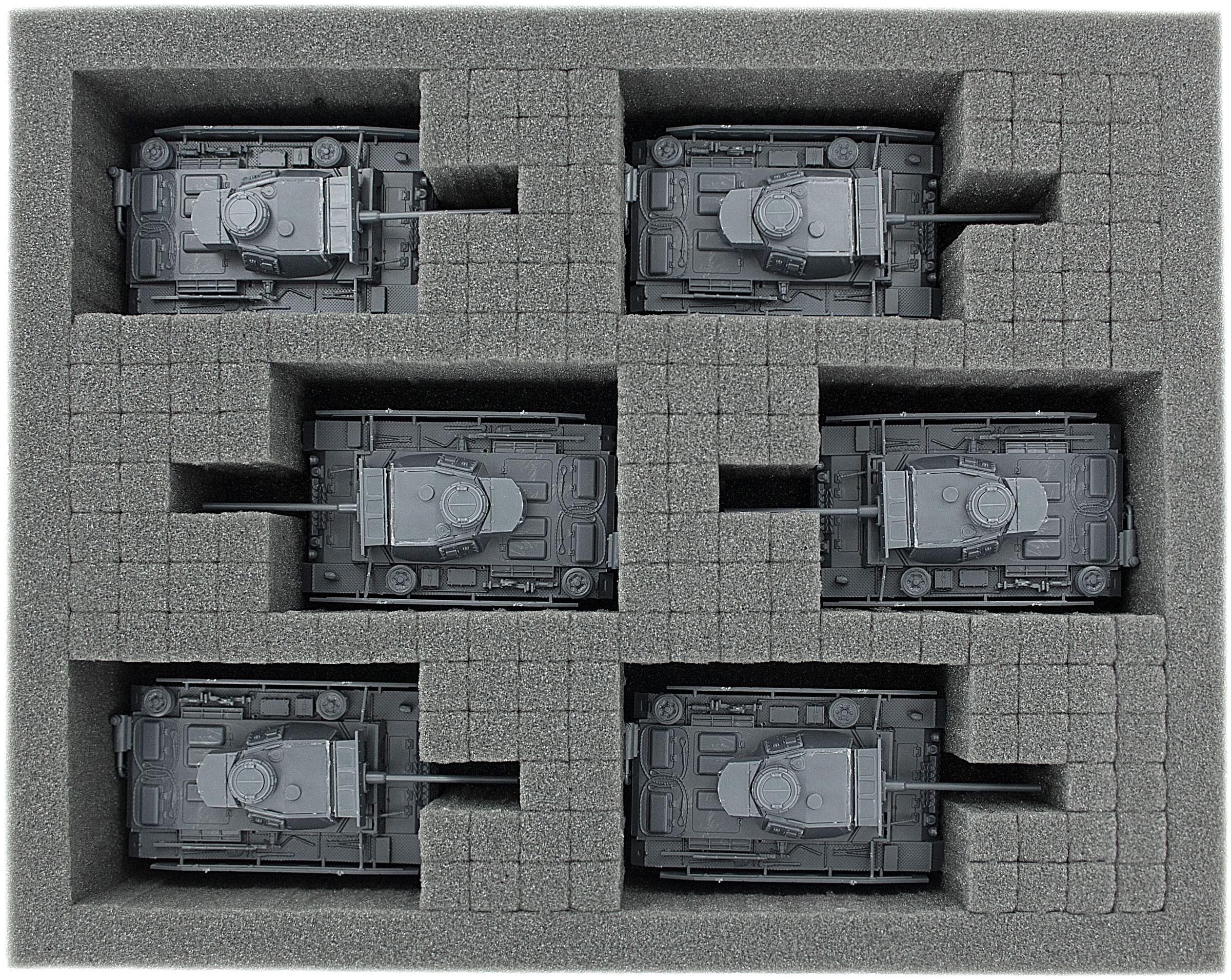 The Set contains two raster foam trays for tanks. The first tray is ideally suited to hold 6 tanks the size of „Tiger“-tanks. The second tray will hold up 3 larger „King Tiger“ tanks or tanks of similar sizes.