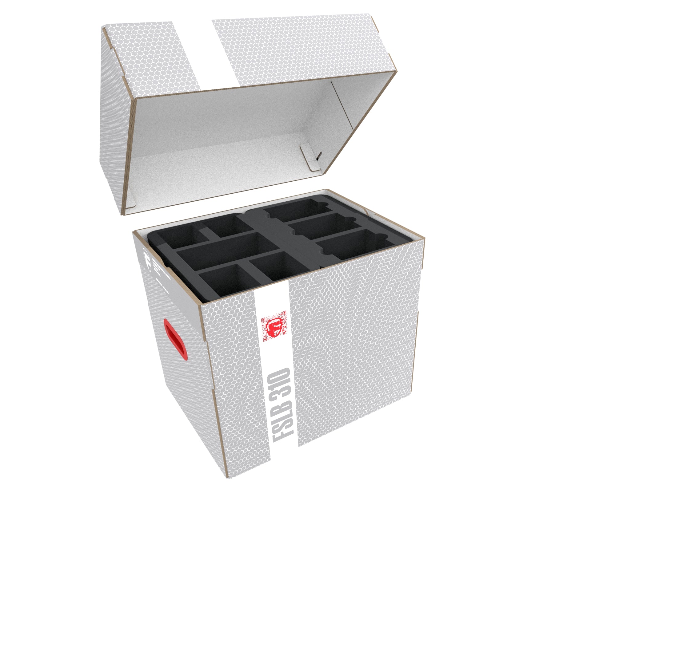 - 2 foam trays with 25 compartments each for tokens, dice and small miniatures (FSLQ050BO)