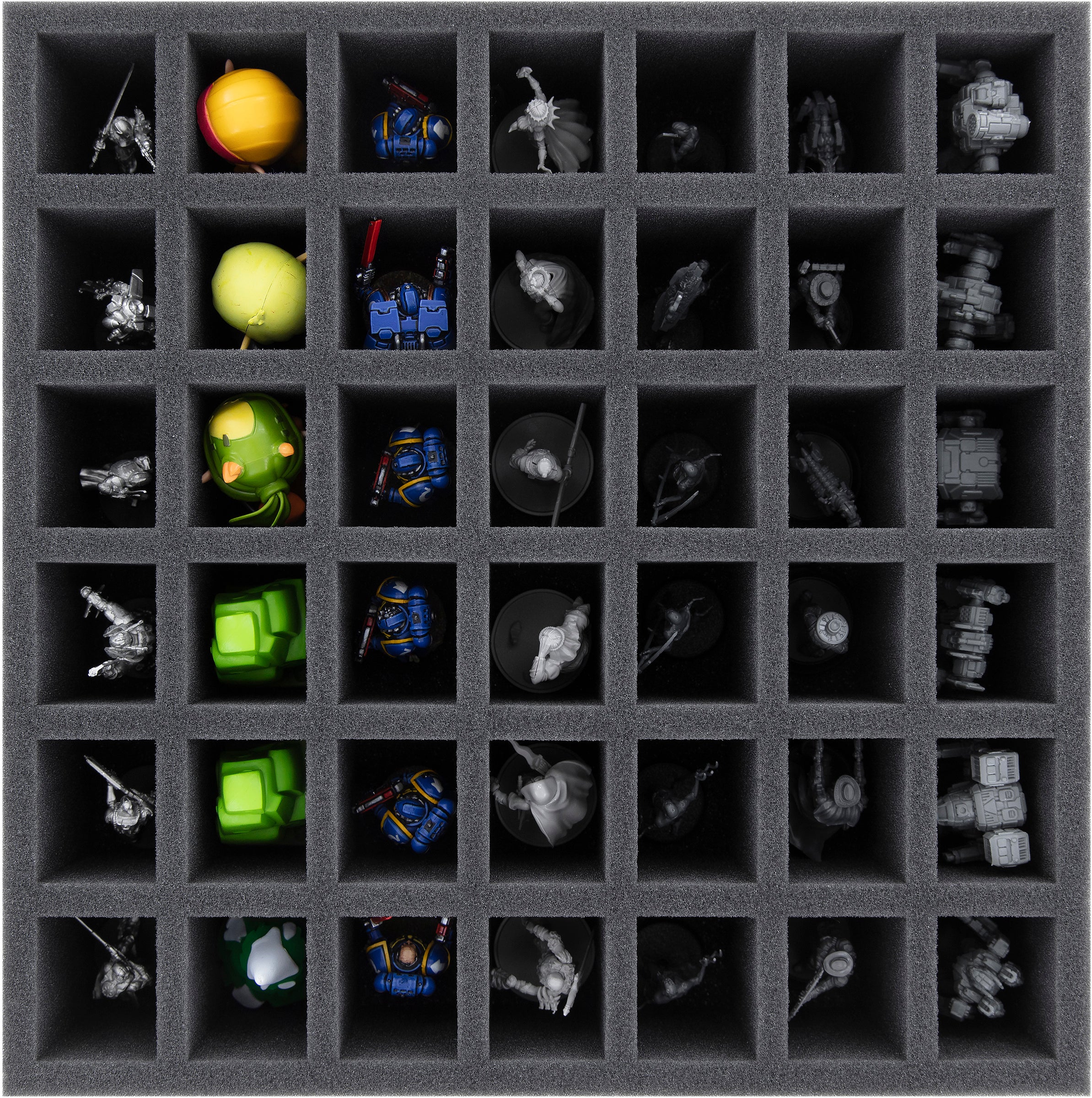 The foam tray has 42 compartments which will hold miniatures of different sizes. The fine-pored foam reliably protects your figures – fragile parts remain intact, the color of painted models remains unharmed.