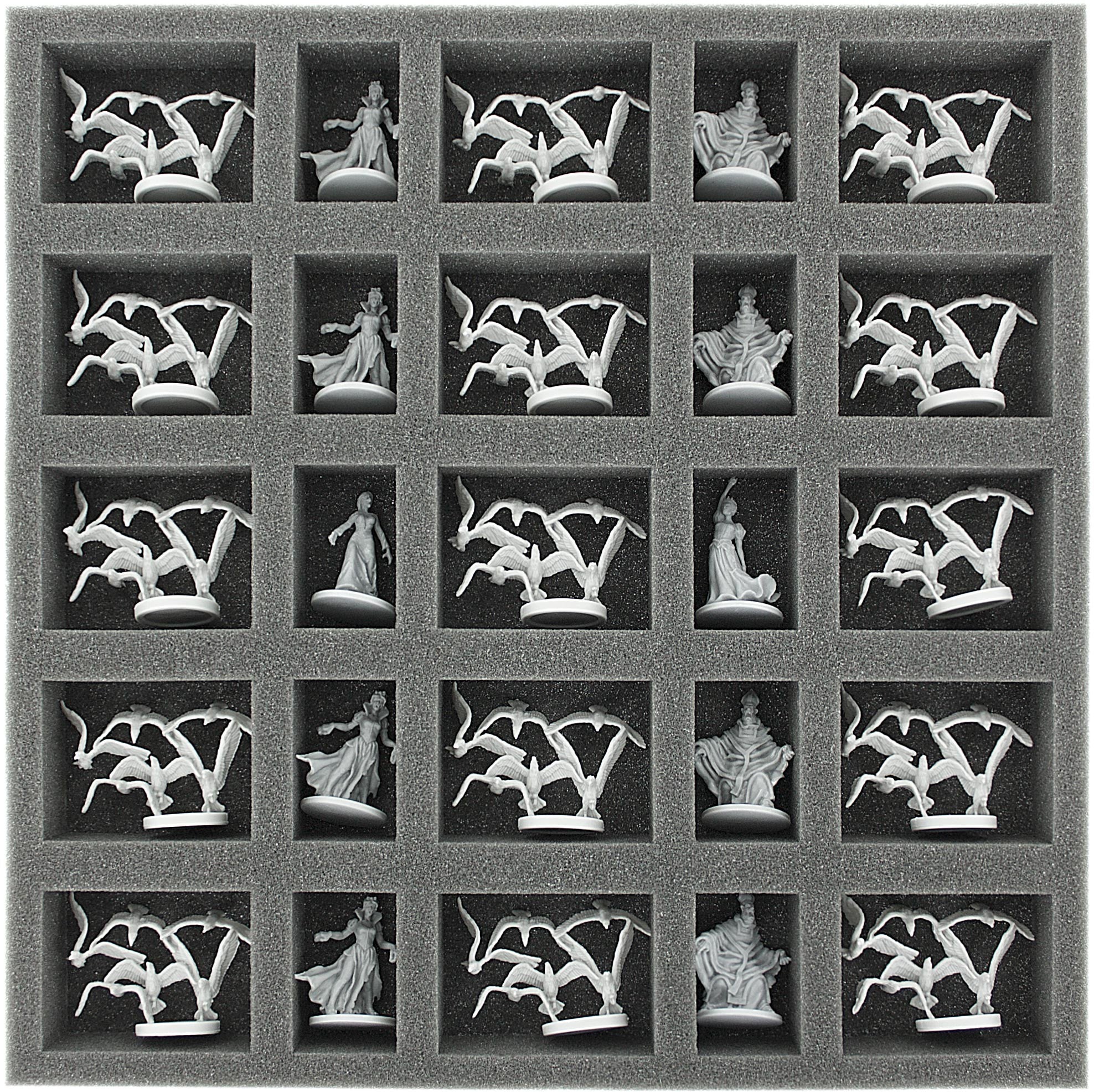 The foam trays have 50 compartments total which will hold miniatures of different sizes. The fine-pored foam reliably protects your figures – fragile parts remain intact, the color of painted models remains unharmed.