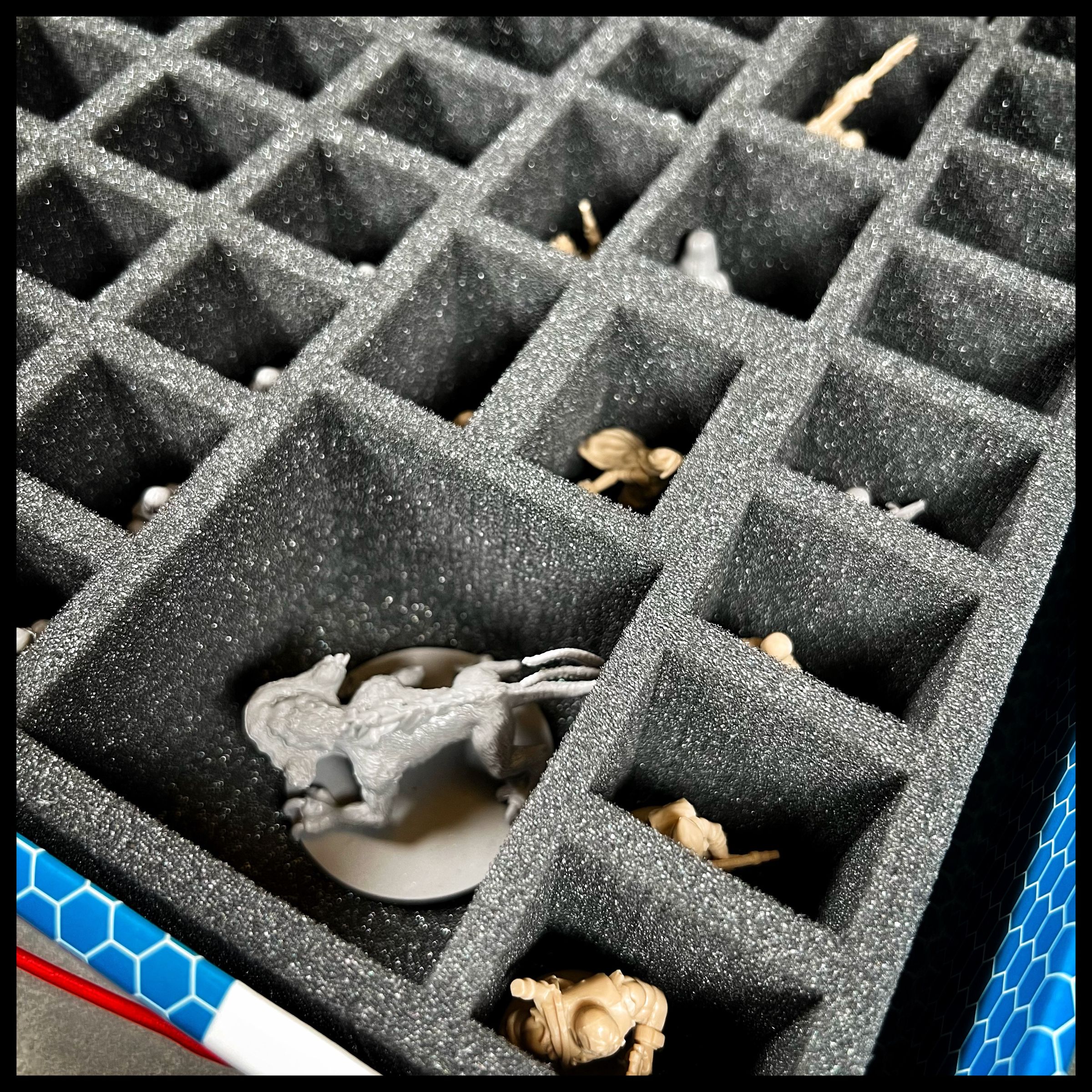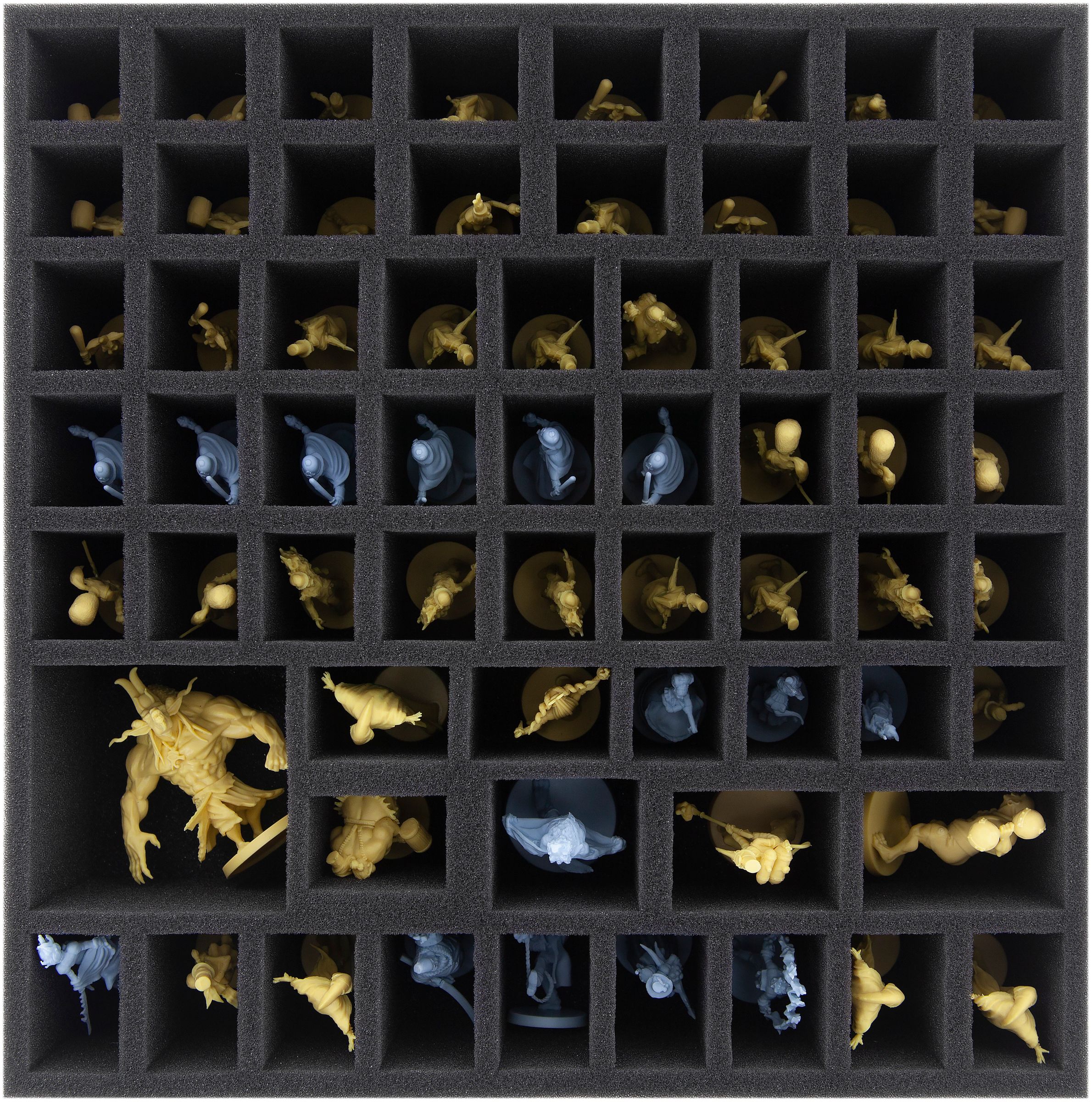 The foam tray has 63 compartments which will hold miniatures of different sizes. The fine-pored foam reliably protects your figures – fragile parts remain intact, the color of painted models remains unharmed.