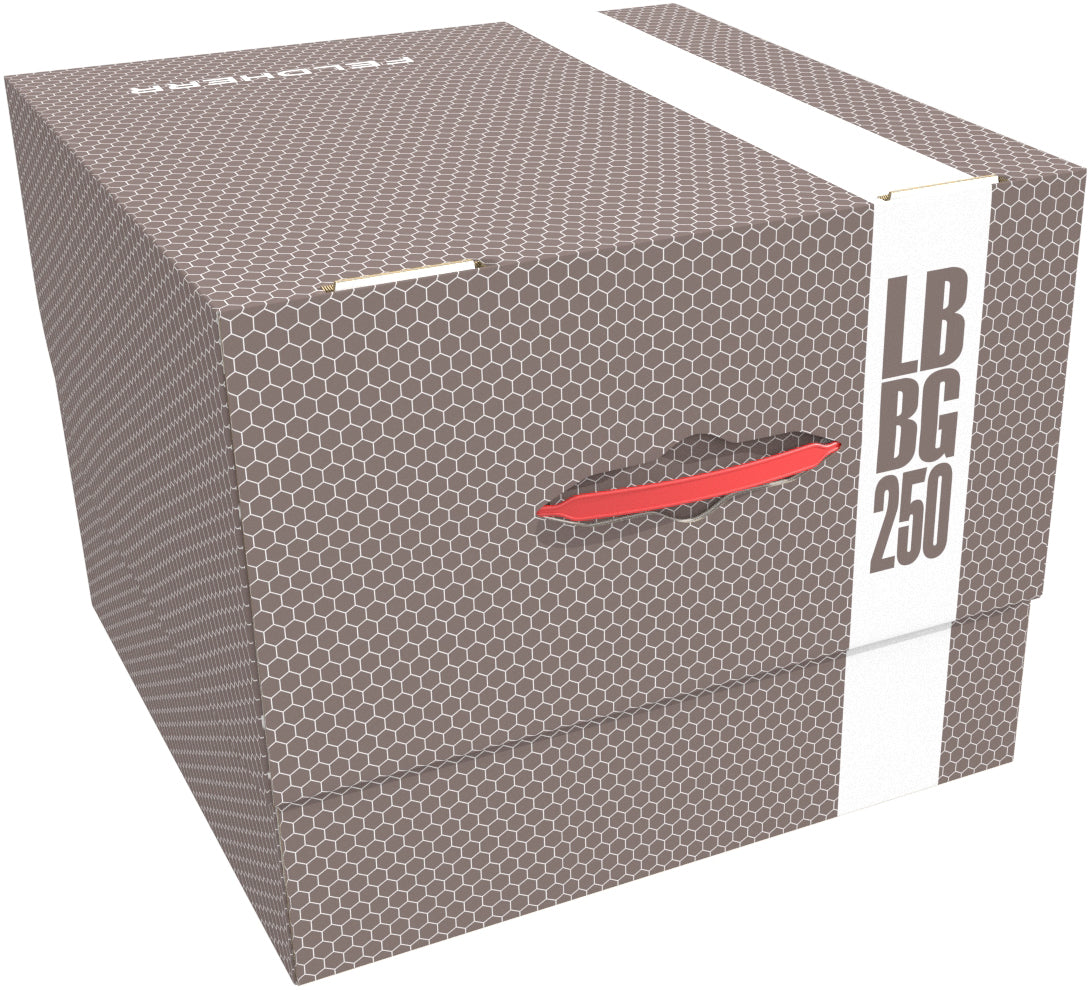 The storage box LBBG250 is made of coated, double-wall cardboard. This makes it not only pleasantly light, but also particularly tear-resistant and stable. With the matching foam trays, miniatures and game material can be stored safely and dust-protected. The practical plastic carrying handle enables easy transport.