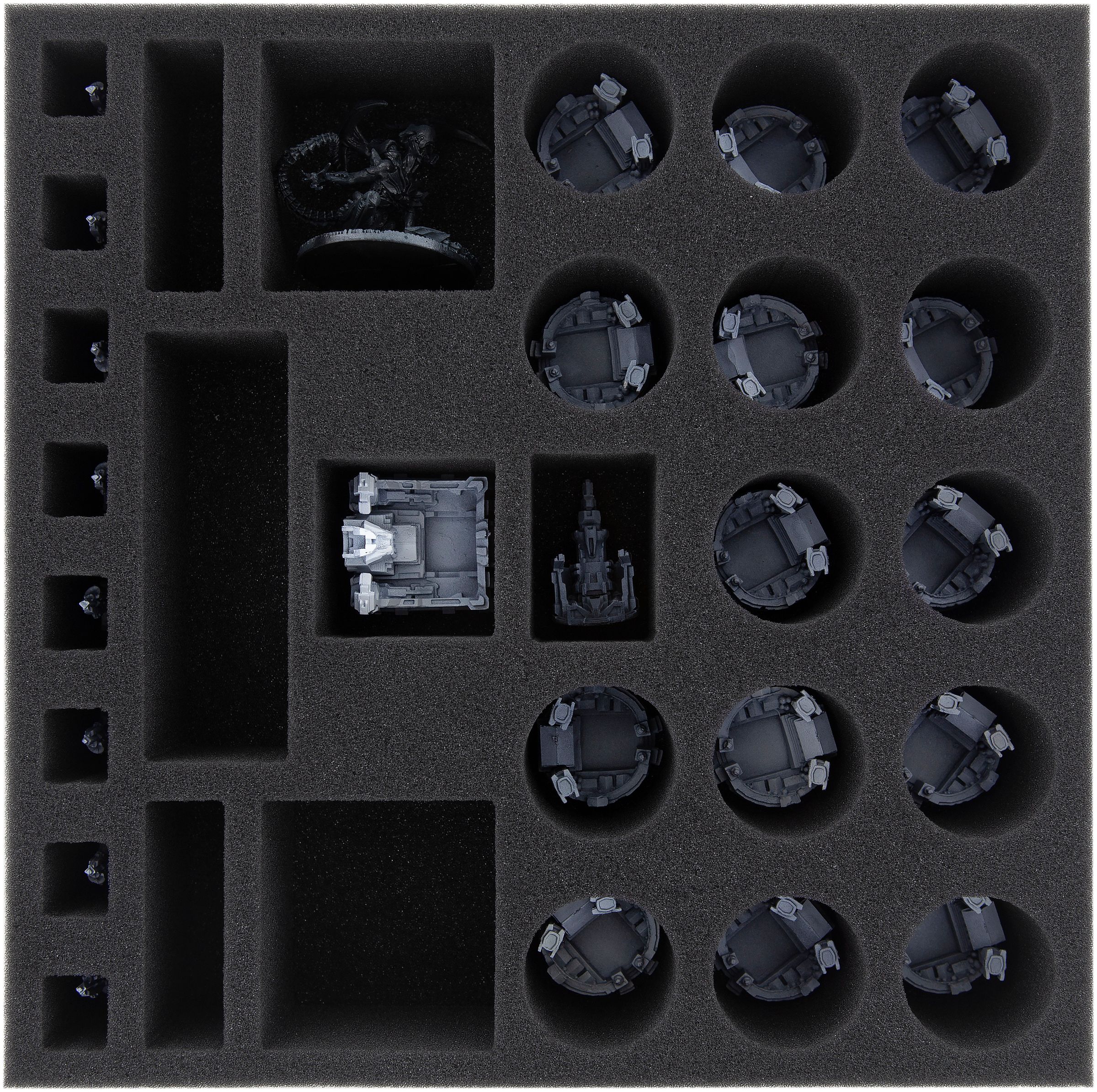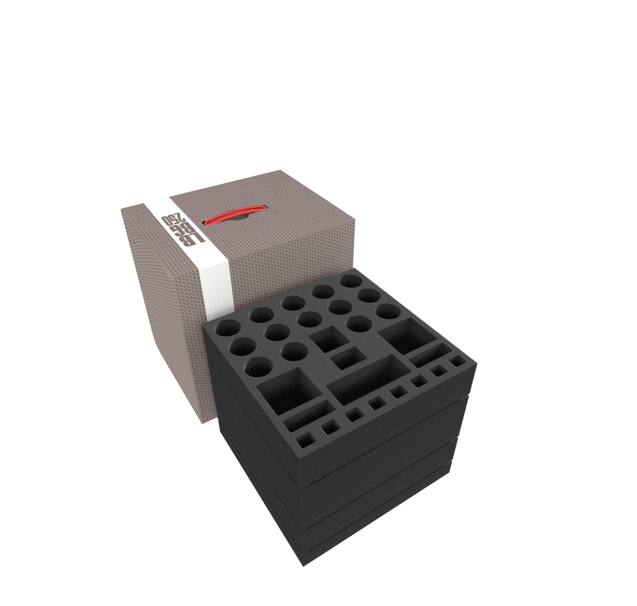 - Foam tray for medium-sized figures und game material: 285 mm x 285 mm x 55 mm total height (45 mm usable height + 10 mm foam base).