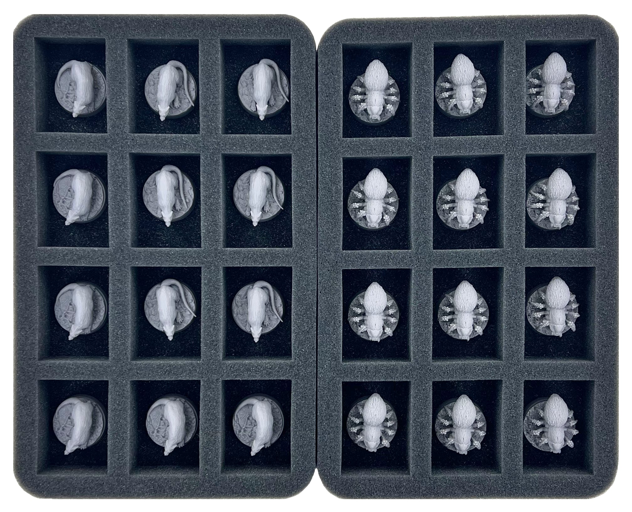 - 2 Half-Size foam trays, each with 12 compartments for small miniatures (HS035I012BO)
