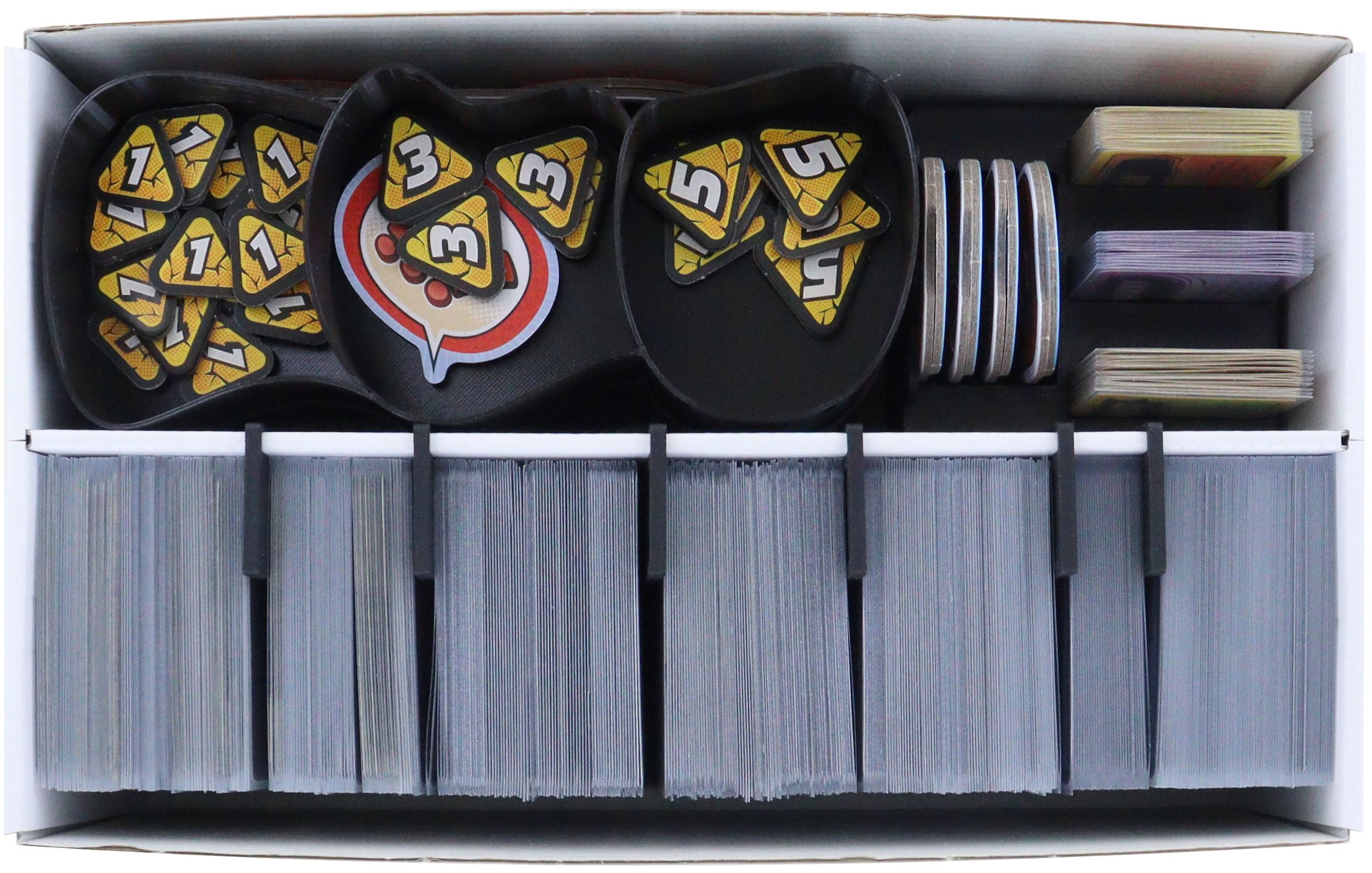 The individually manufactured card and token holders made of robust plastic can all be removed individually and placed on the table at the start of the game.