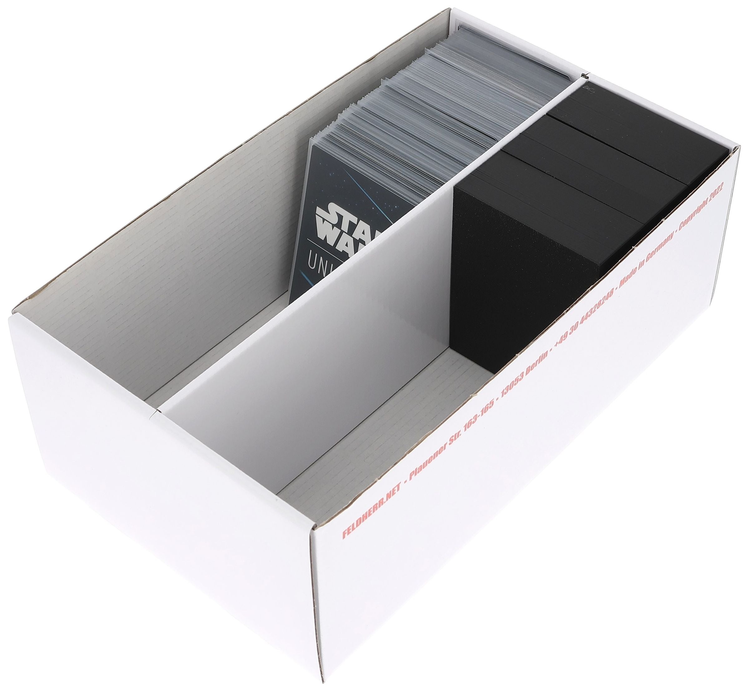 The Storage Box consists of a box and a lid. Both parts are made of coated cardboard. A partition in the middle of the box divides it into two equally sized compartments. The slip-on cover protects the cards from dust and other external influences.