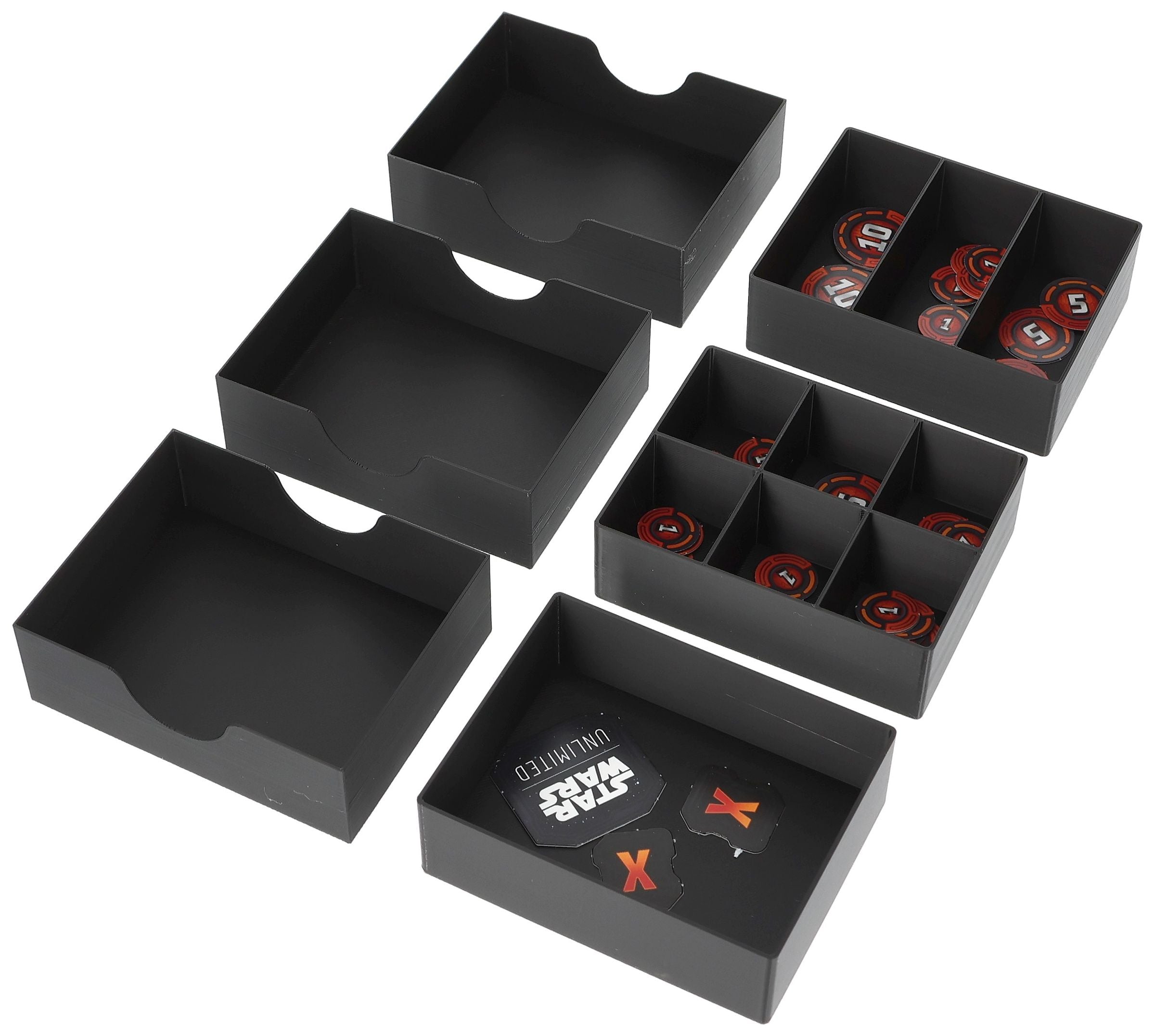 Up to 1300 cards fit into this card box. Three token trays take care of your small-sized game materials. With this, you'll have most of your collection readily available and easily handle any disturbances in the Force.