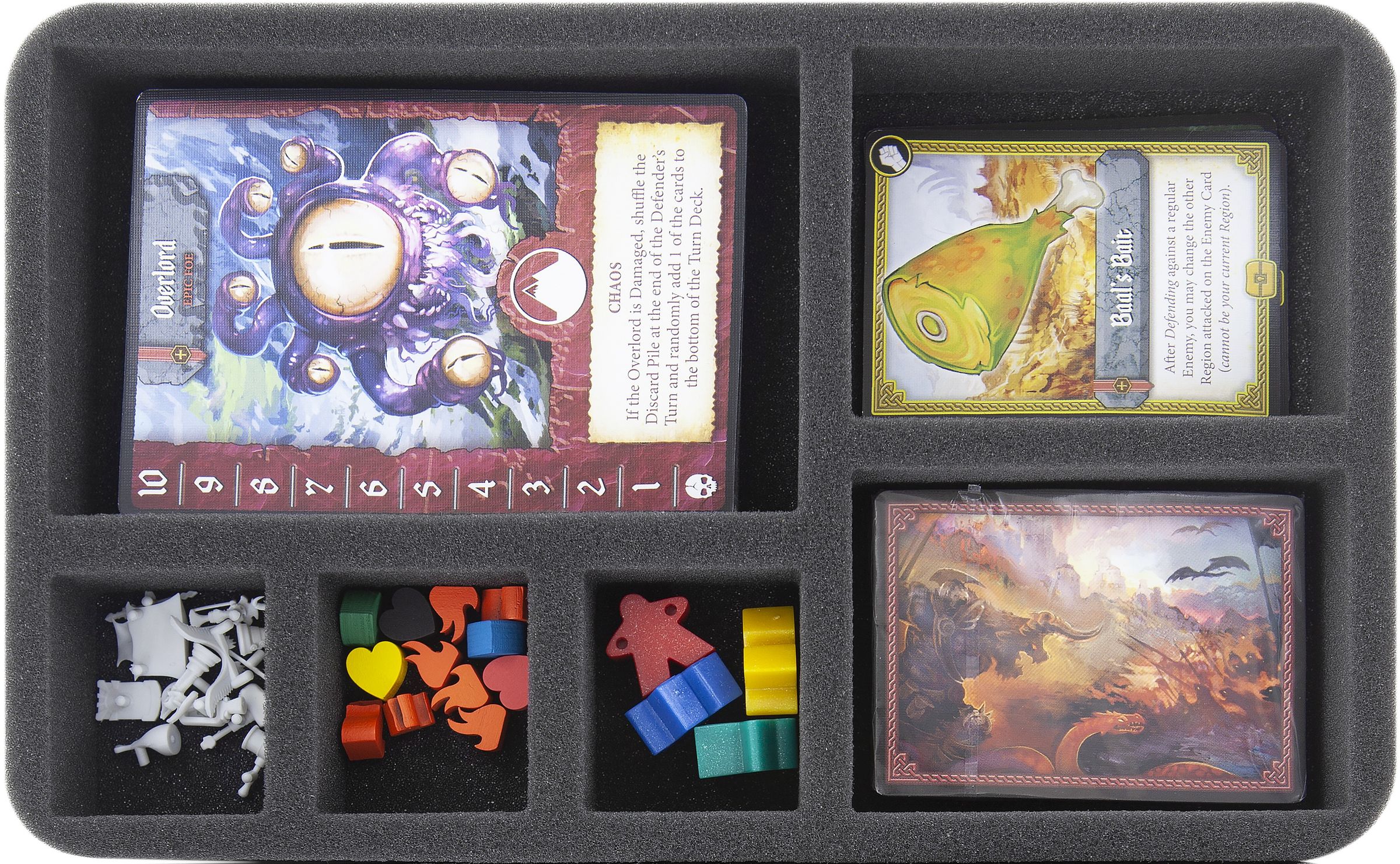 So that your game materials are orderly stored and comfortably transported, Feldherr offers you this Magnetic Box green with the matching foam tray for all cards, tokens, artifacts and meeples of the „Tiny Epic: Defenders“ box by Gamelyn Games.