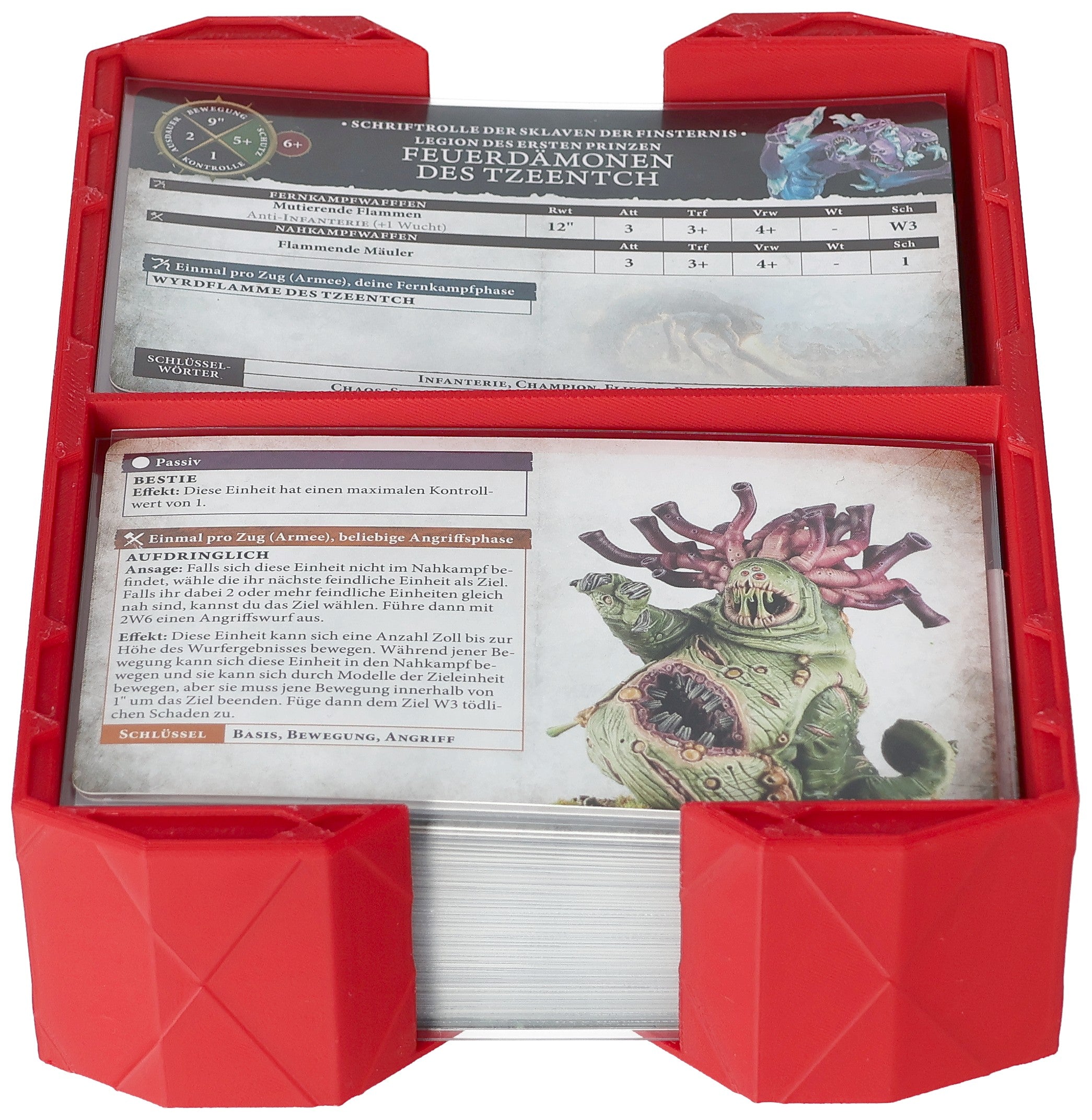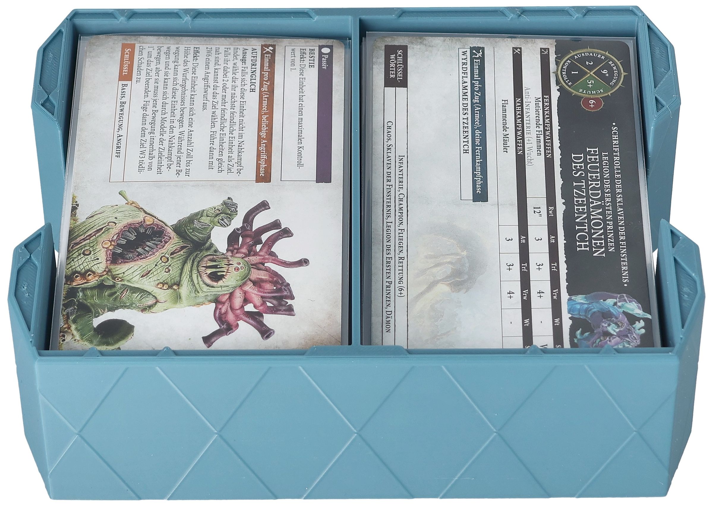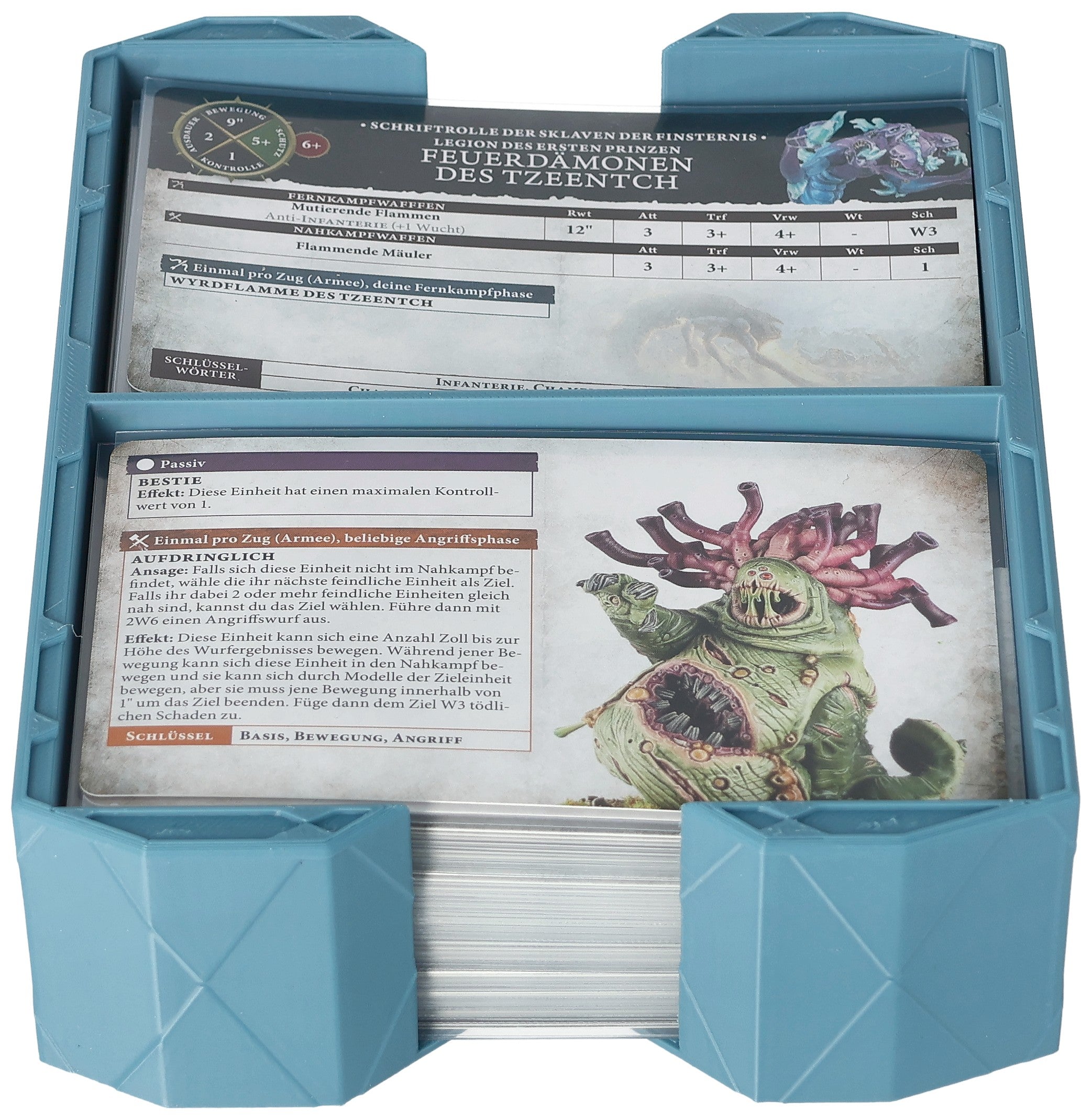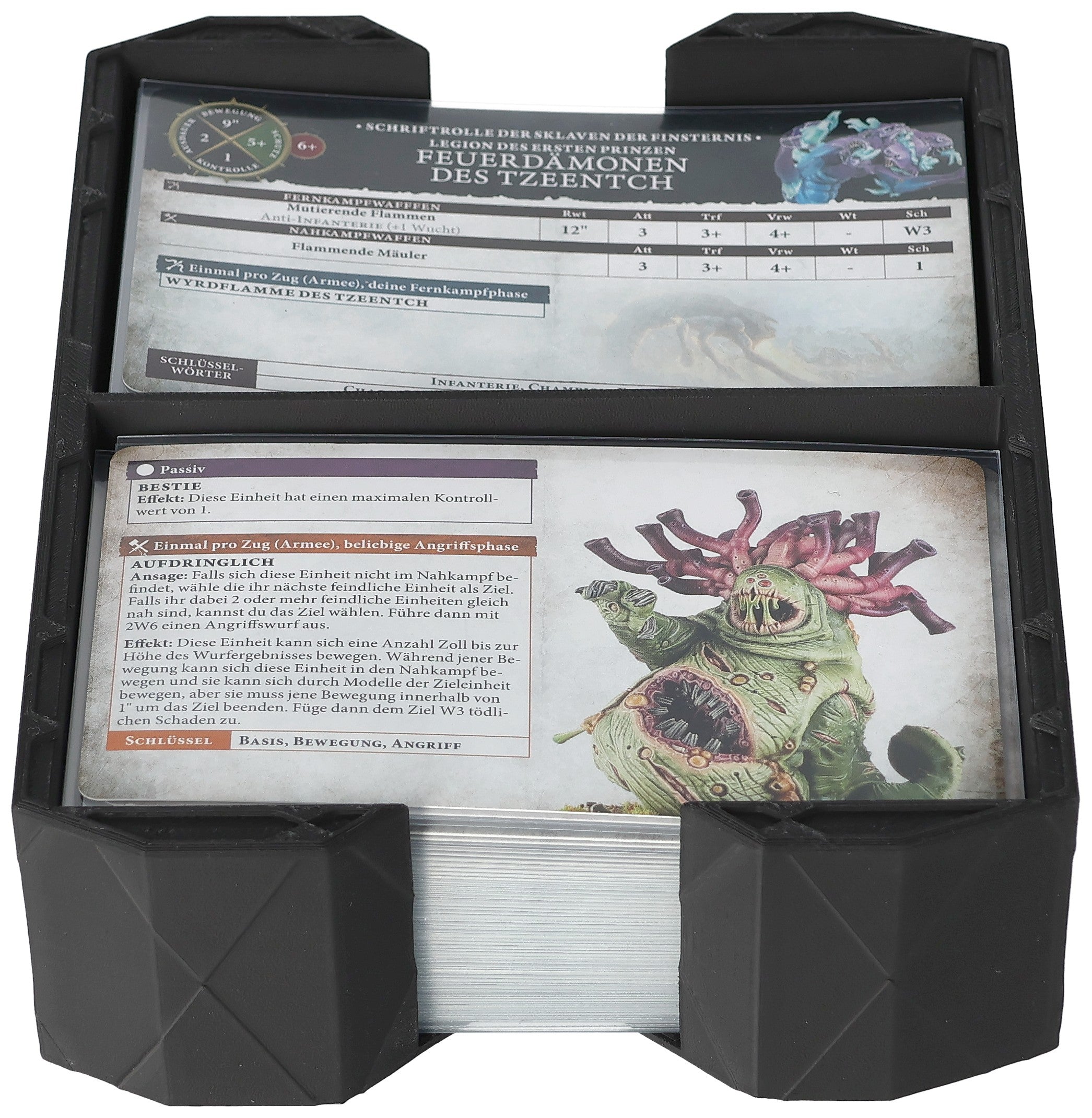 • Specially designed for AoS Warscroll Cards in 70 x 121 mm format, one card holder holds up to 300 cards without sleeves or 150 cards with sleeves. In total you have space for 600 cards (300 sleeved).