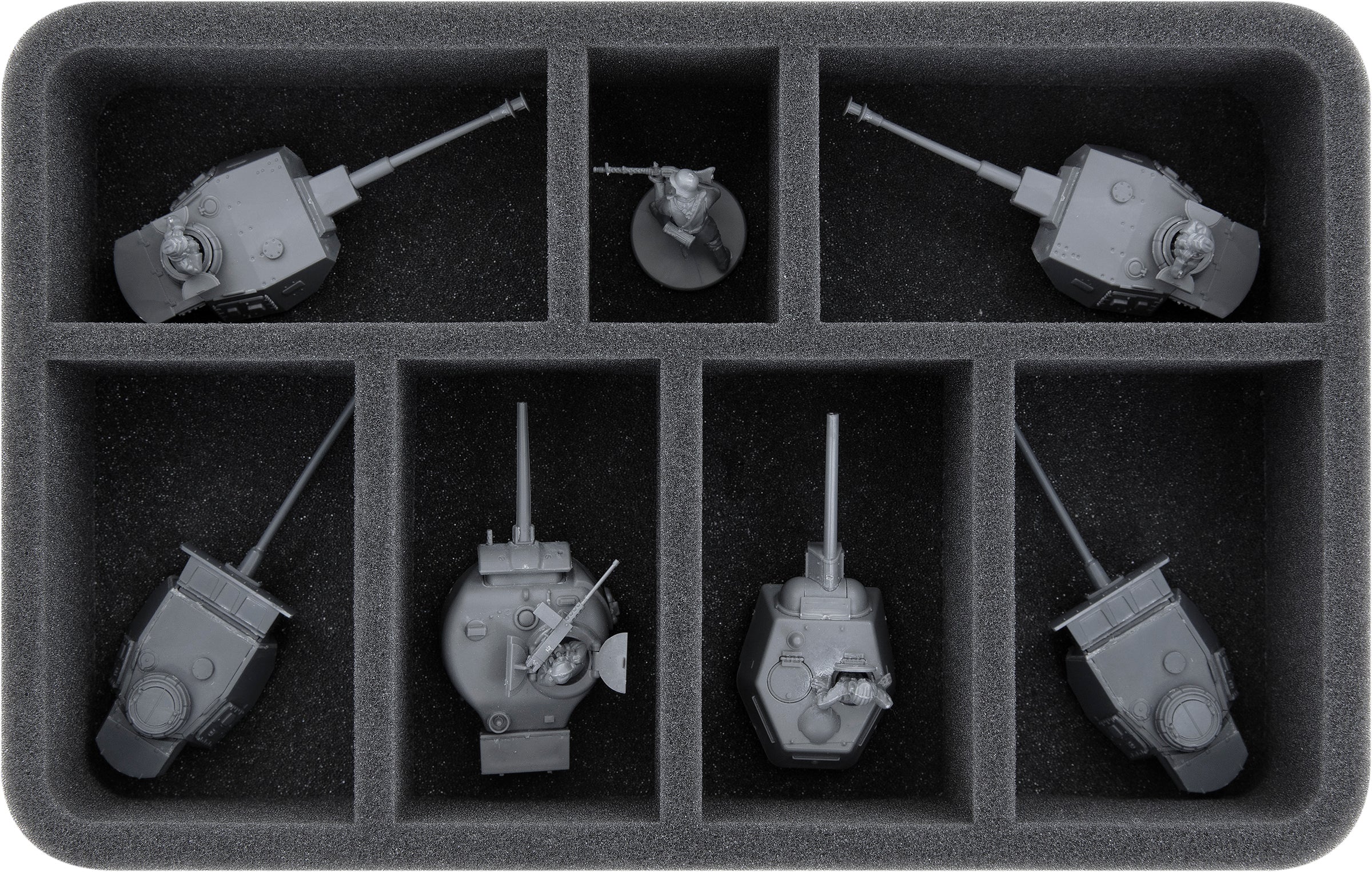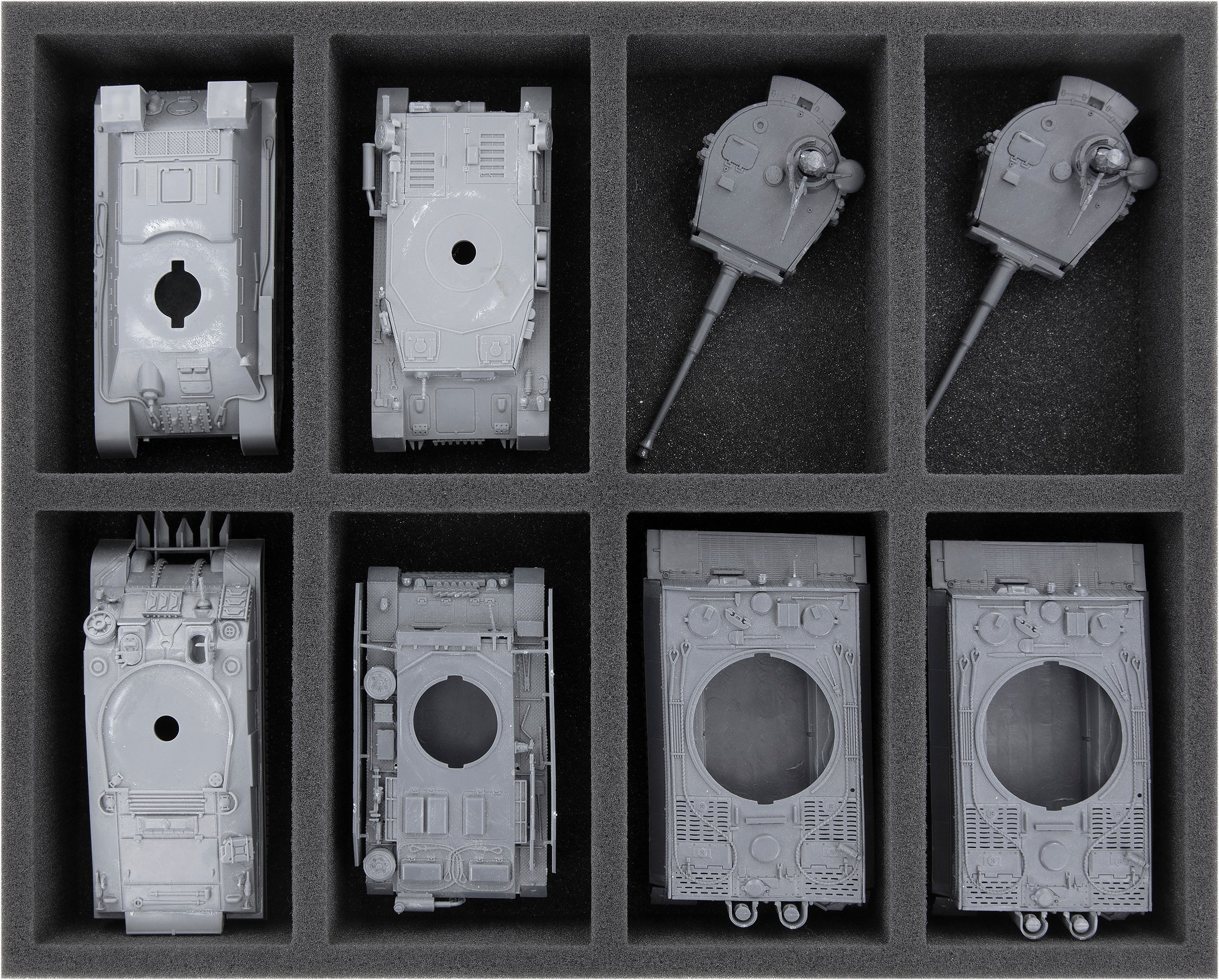 - 2 Full-Size foam trays with each 8 compartments for tank hulls suitable for the models Tank III, Tank IV, T34, M4 Sherman, Tiger (FS050A073)