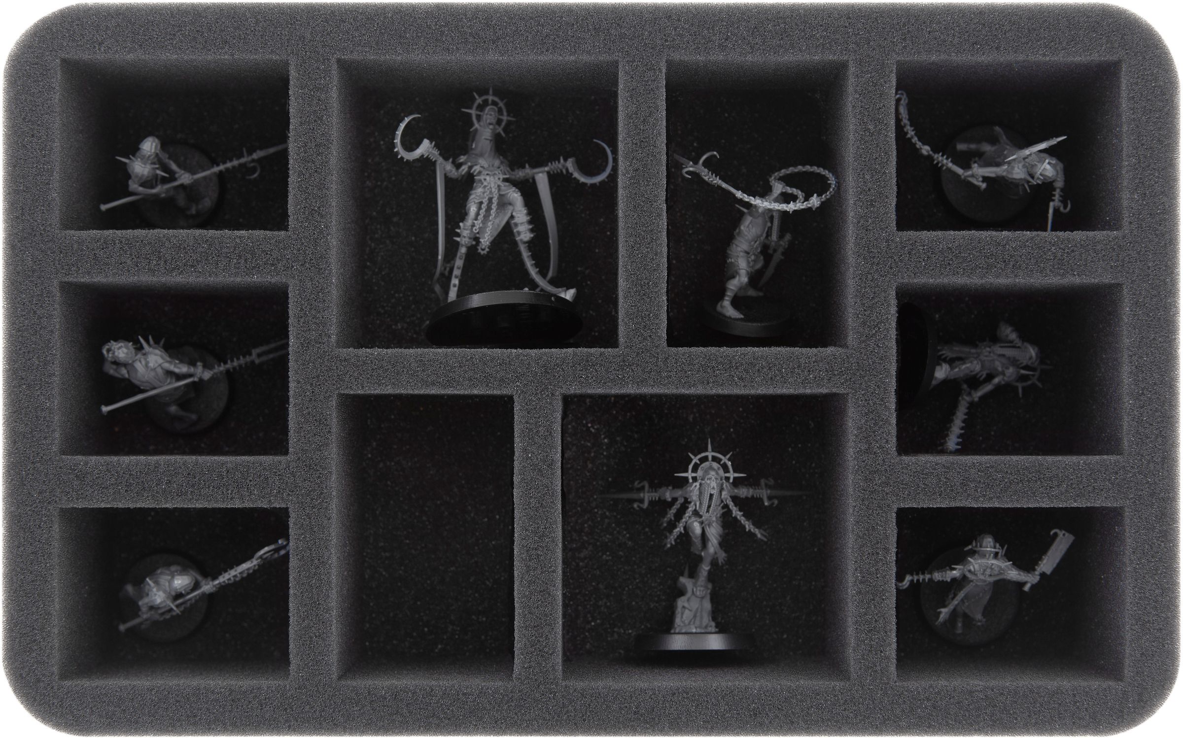 Custom-fit compartments of soft foam reliably protect your miniatures from damage and ensure that your painted units arrive safely at the tabletop without scratches.