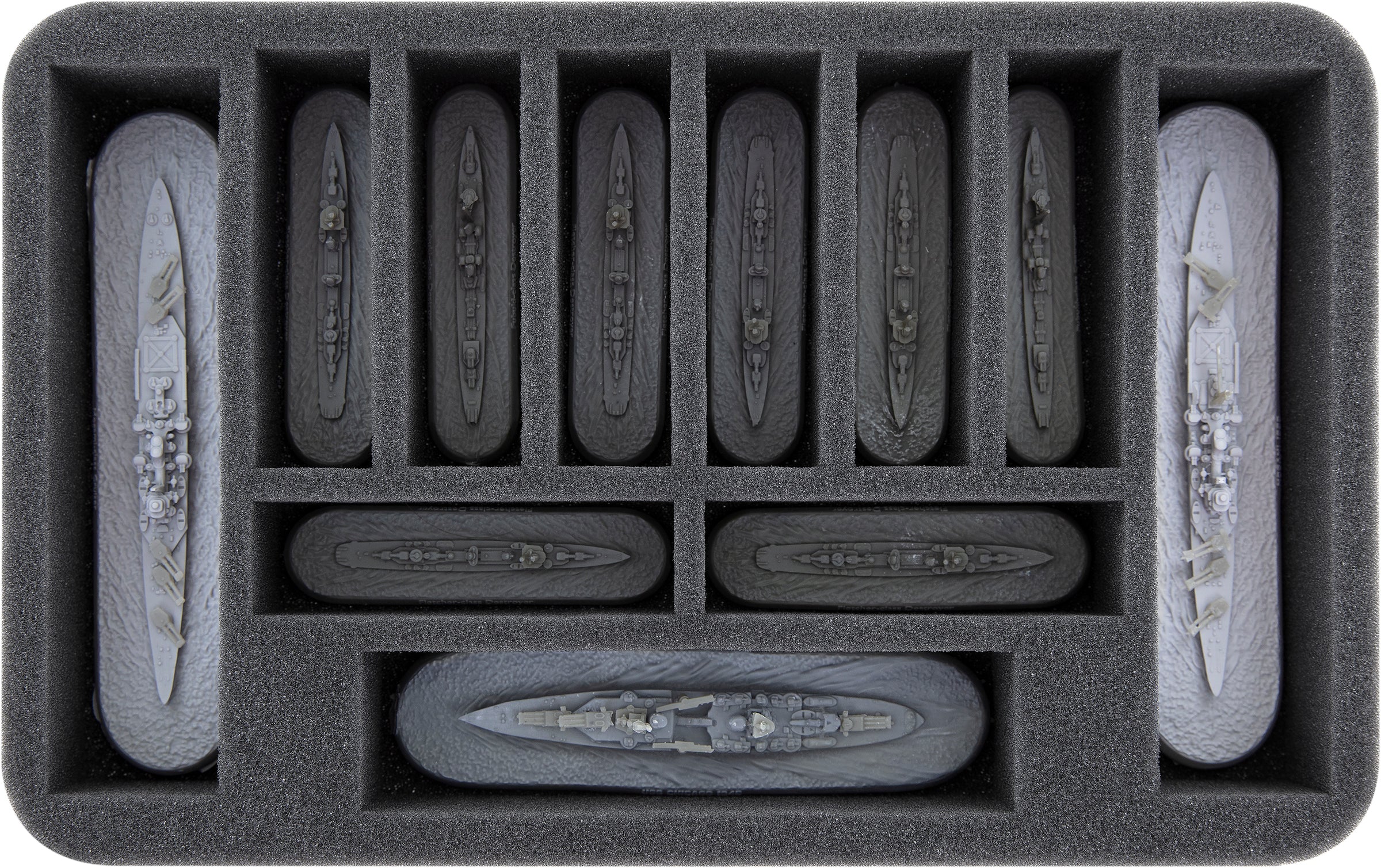 - 2 Half-Size foam trays each for 11 miniatures e.g. smaller Fubuki or Fletcher-class Destroyers or larger ships such as the USS Indianapolis or Kumano 1944 (HSMFAF045BO)
