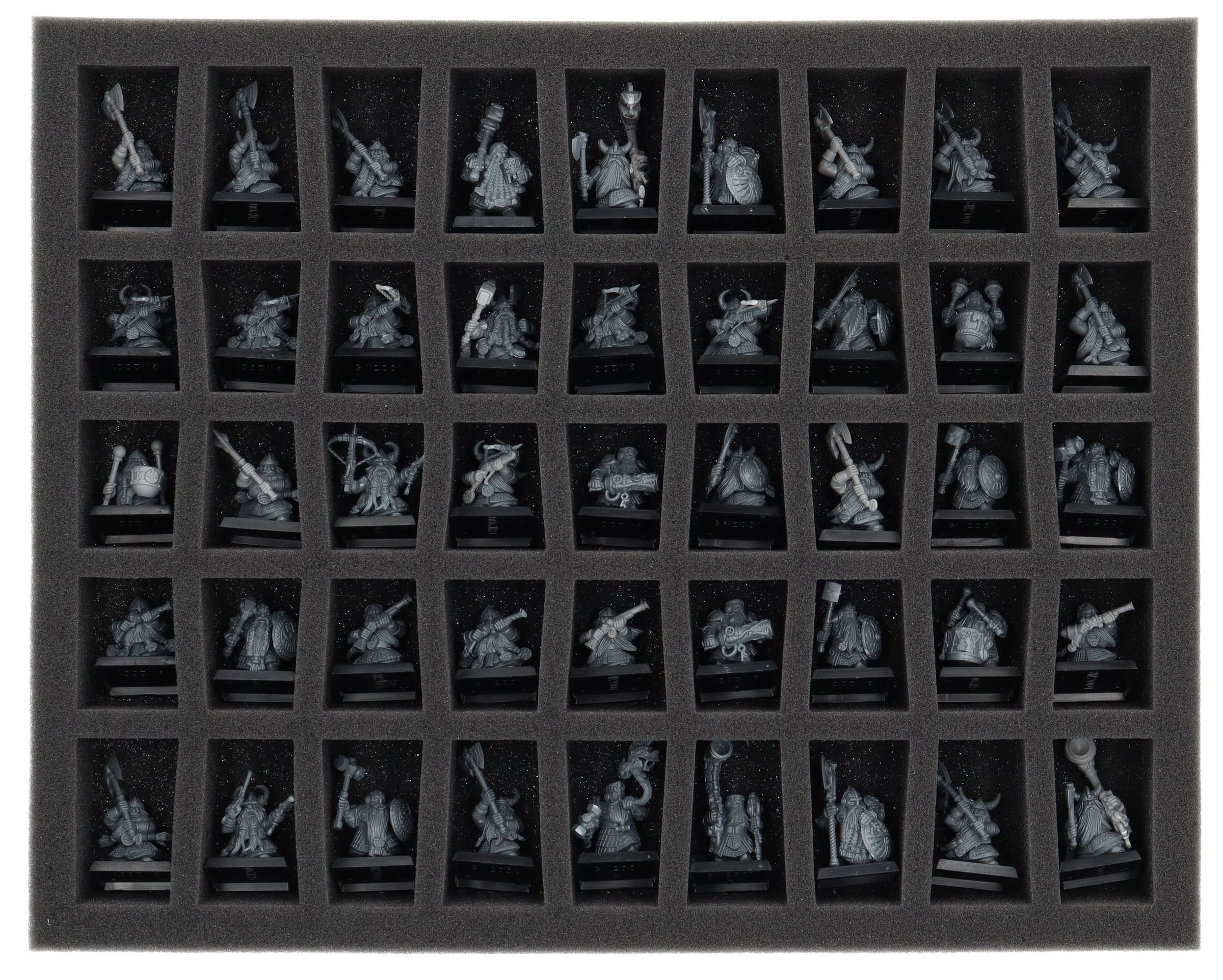 - 1 x FS040A045 – foam tray with 45 compartments for e.g. Dwarf Warriors, Dwarf Quarrelers, Dwarf Ironbreakers, Dwarf Hammerers, Dwarf Slayers