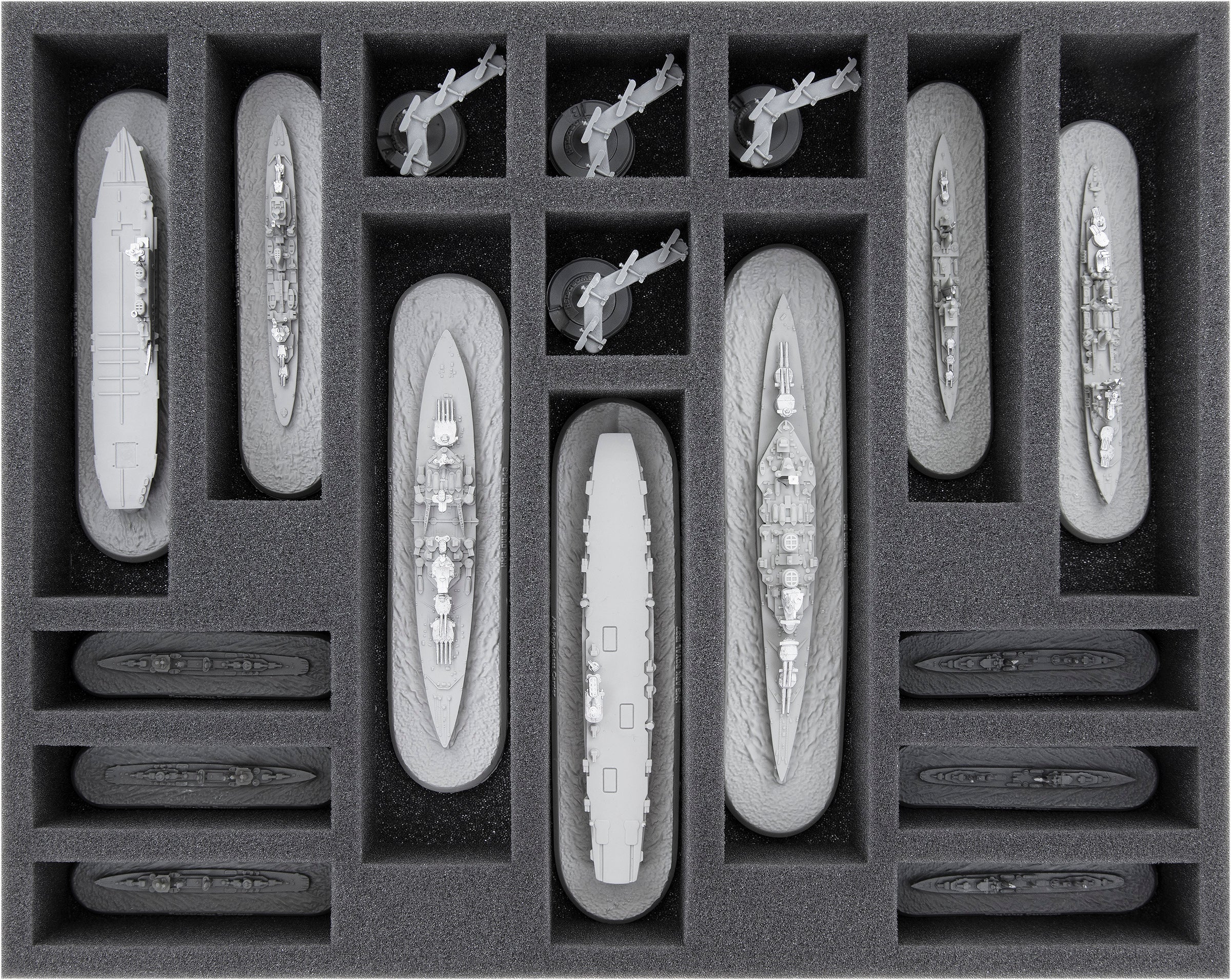 - 2 Half-Size foam trays each for 11 miniatures e.g. smaller Fubuki or Fletcher-class Destroyers or larger ships such as the USS Indianapolis or Kumano 1944 (HS045A011)