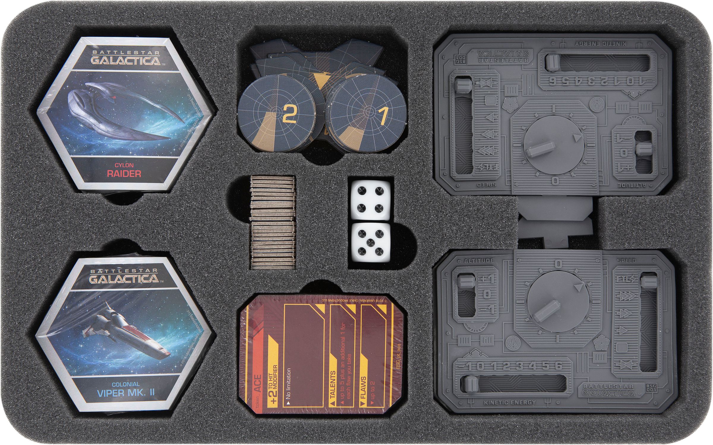 Your spaceships are parked in the foam tray with 10 compartments. The fine-pored foam provides ultimate protection – wings will stay intact, surfaces will not get scratched. In addition to the spaceships, the tray will help you sort game material like e. g. dice, tokens and markers.