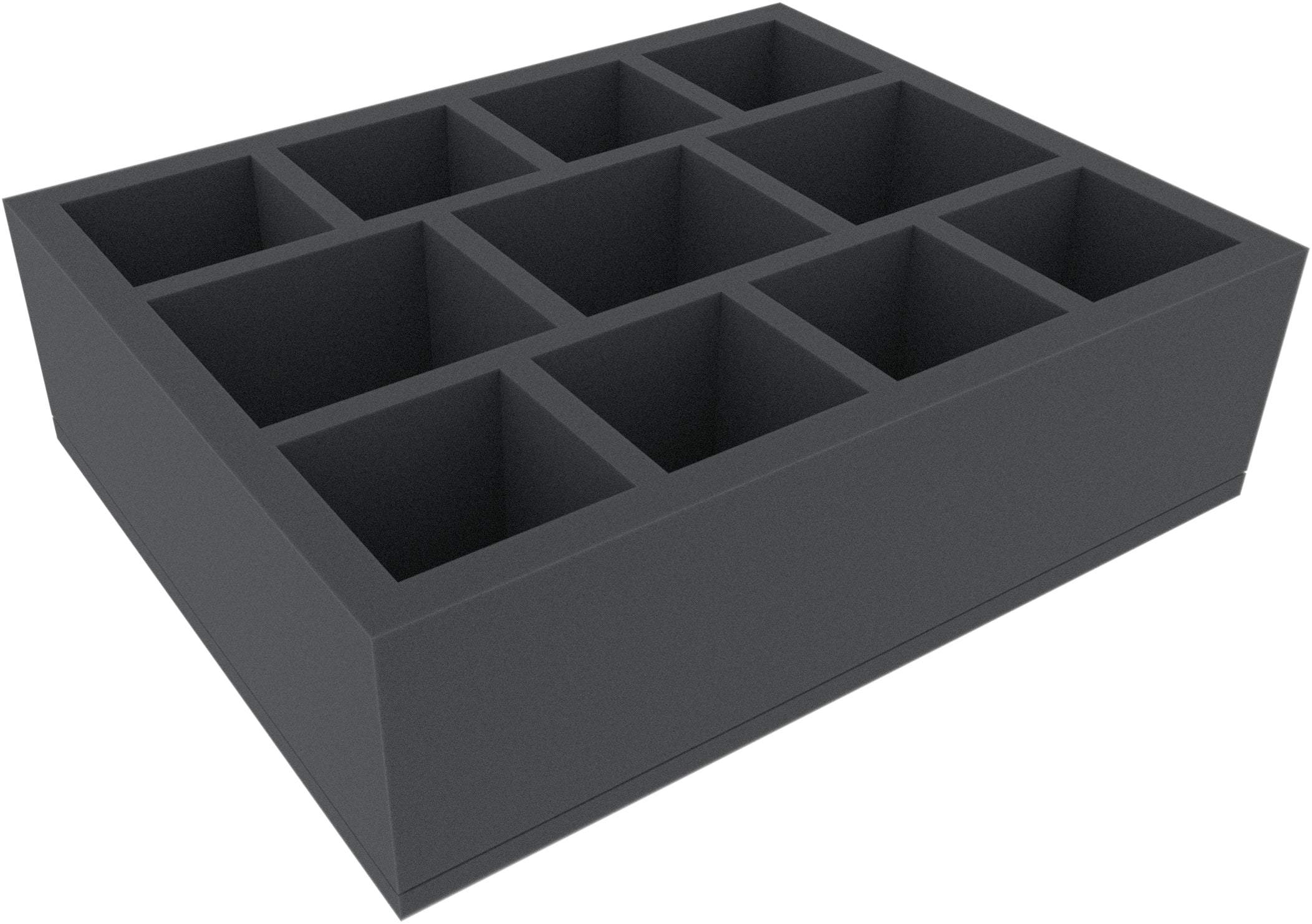 This Full-Size foam tray is divided into 11 large compartments in two different sizes. The insert is particularly suitable for safely storing and transporting larger miniatures. But also accessories, such as tokens and tiles, can be stored neatly here.