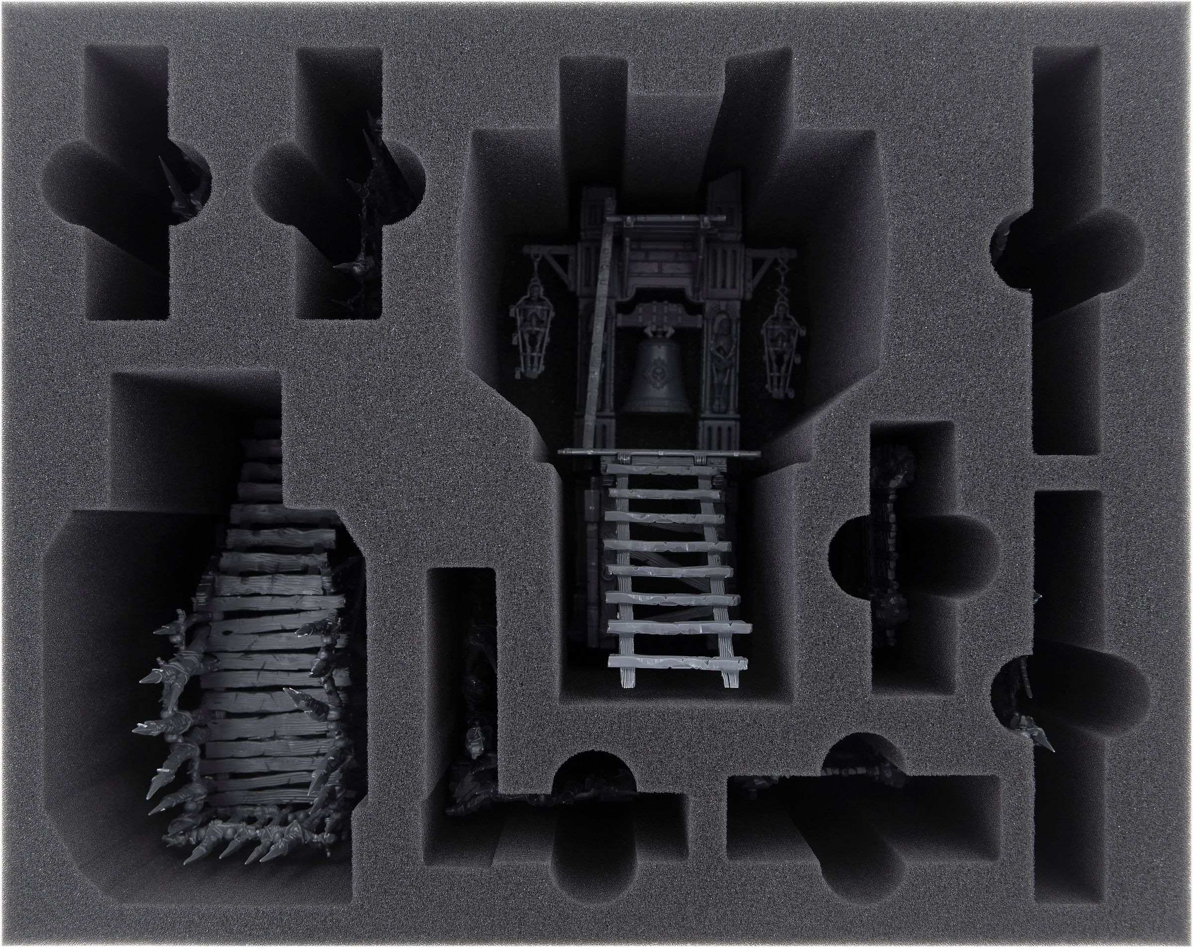 Thanks to the miniature exact cut, the miniatures do not slip around during transport. Not only the filigree and pointed parts, such as the skeletons on the bell tower, are excellently protected from damage. The colors of the painted miniatures also remain free from scratches and abrasion.