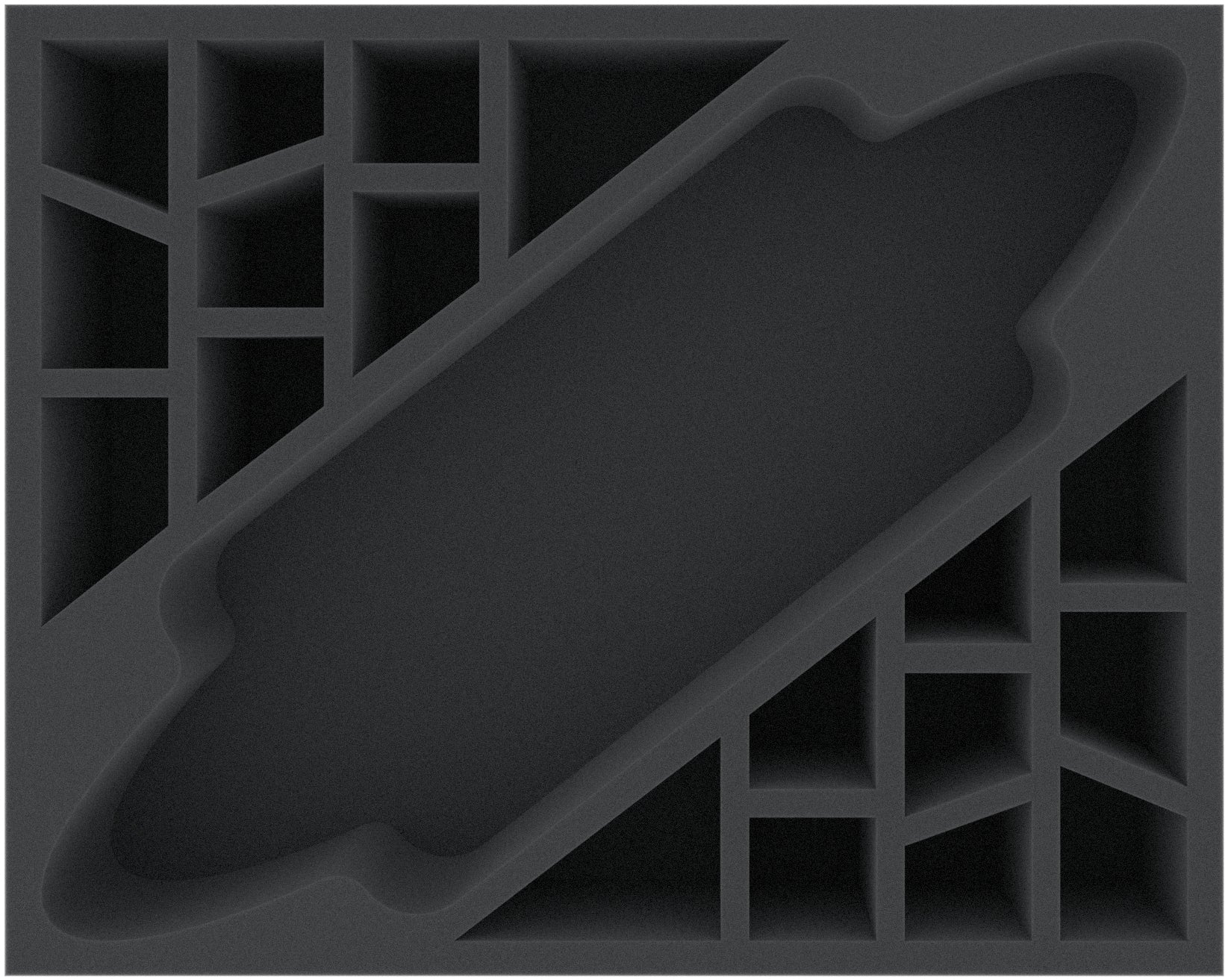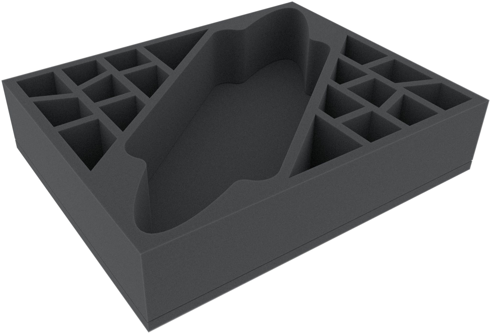 This 75 mm mm high foam tray is divided into 19 compartments. It is particularly suitable for the safe storage of tabletop and board game miniatures, as well as other fragile models and small parts.