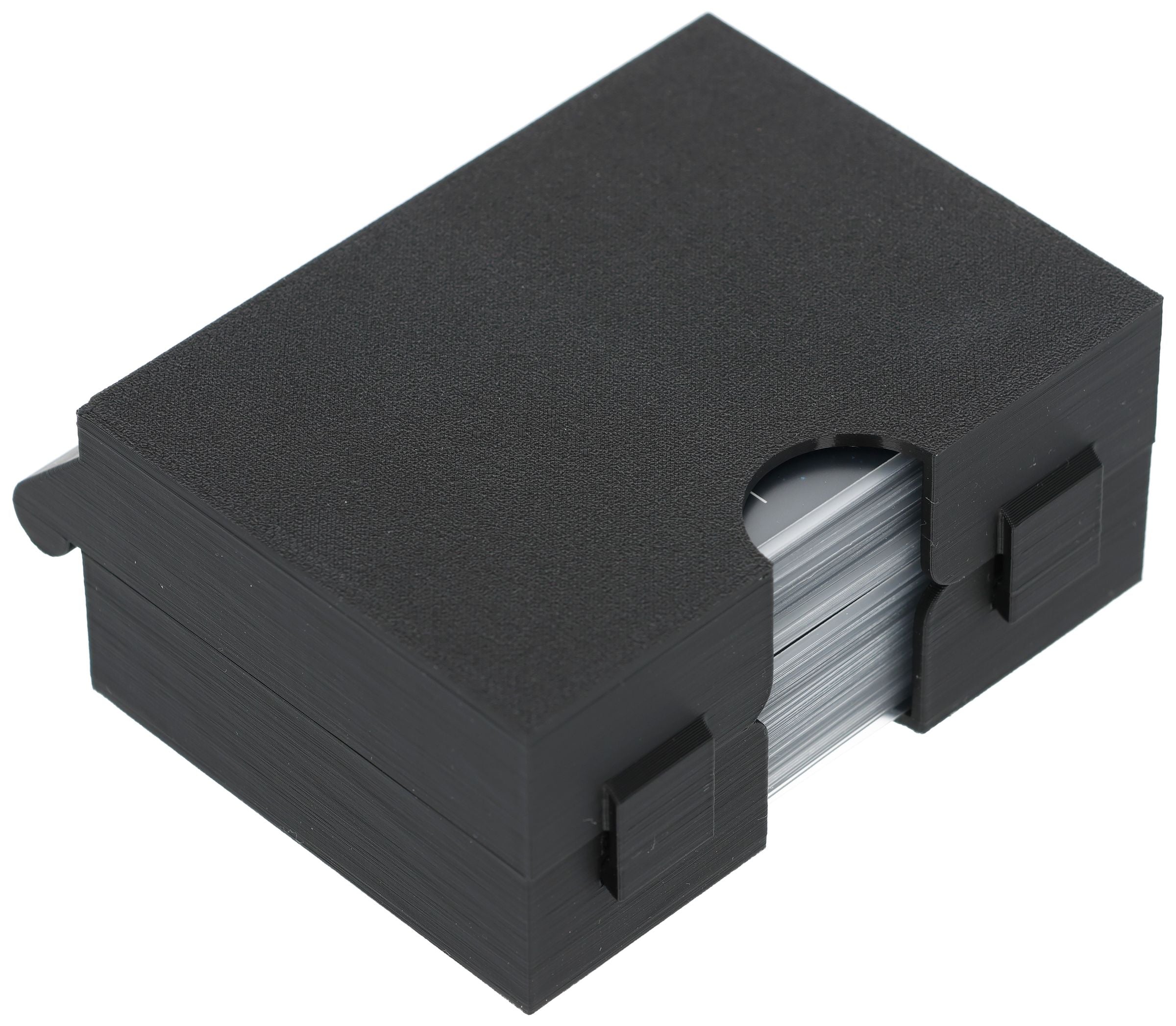 • A space-saving card box that fits into your jacket pocket. Its reliable locking system ensures it won’t open during transport, and the cards stay in place..