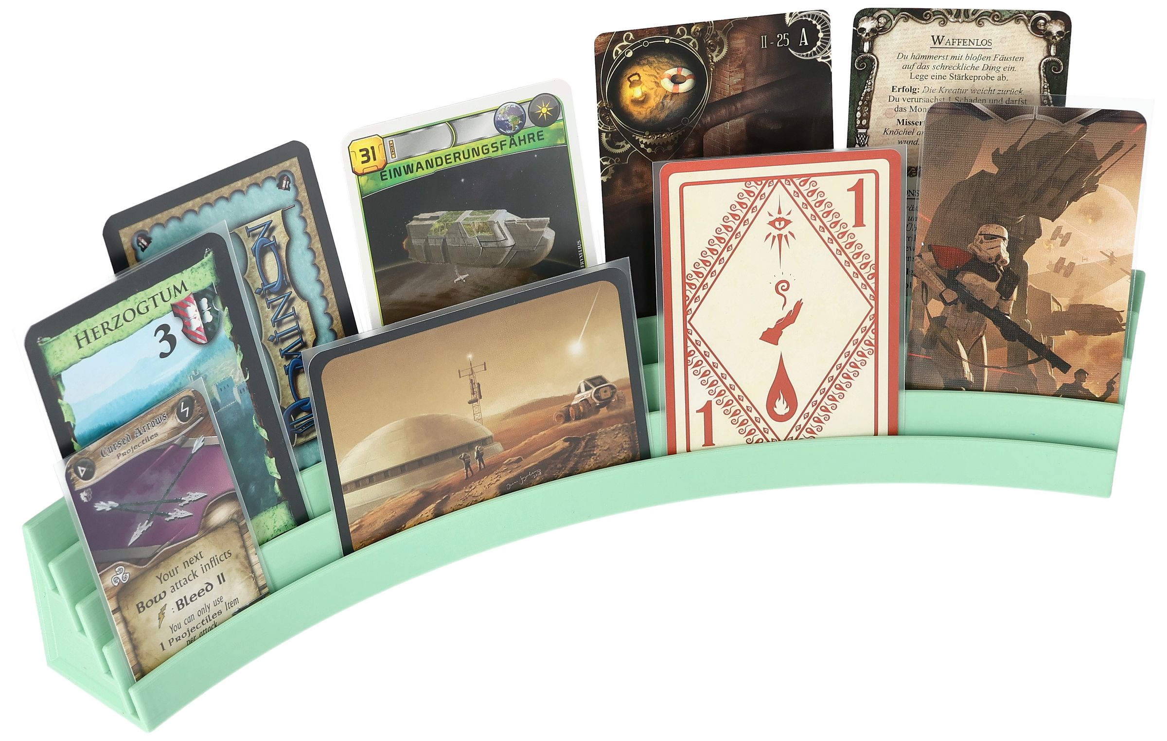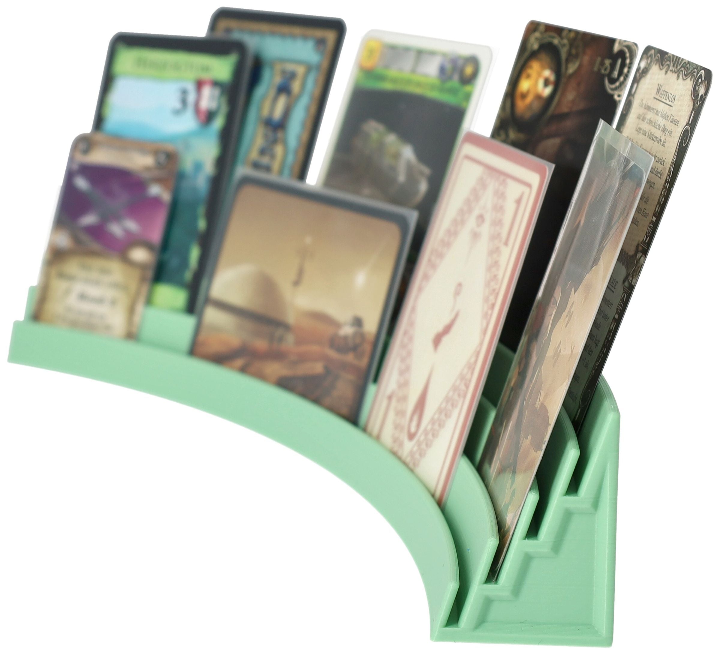 • Tiered structure: All cards remain visible, while the curved shape shields other players from prying eyes