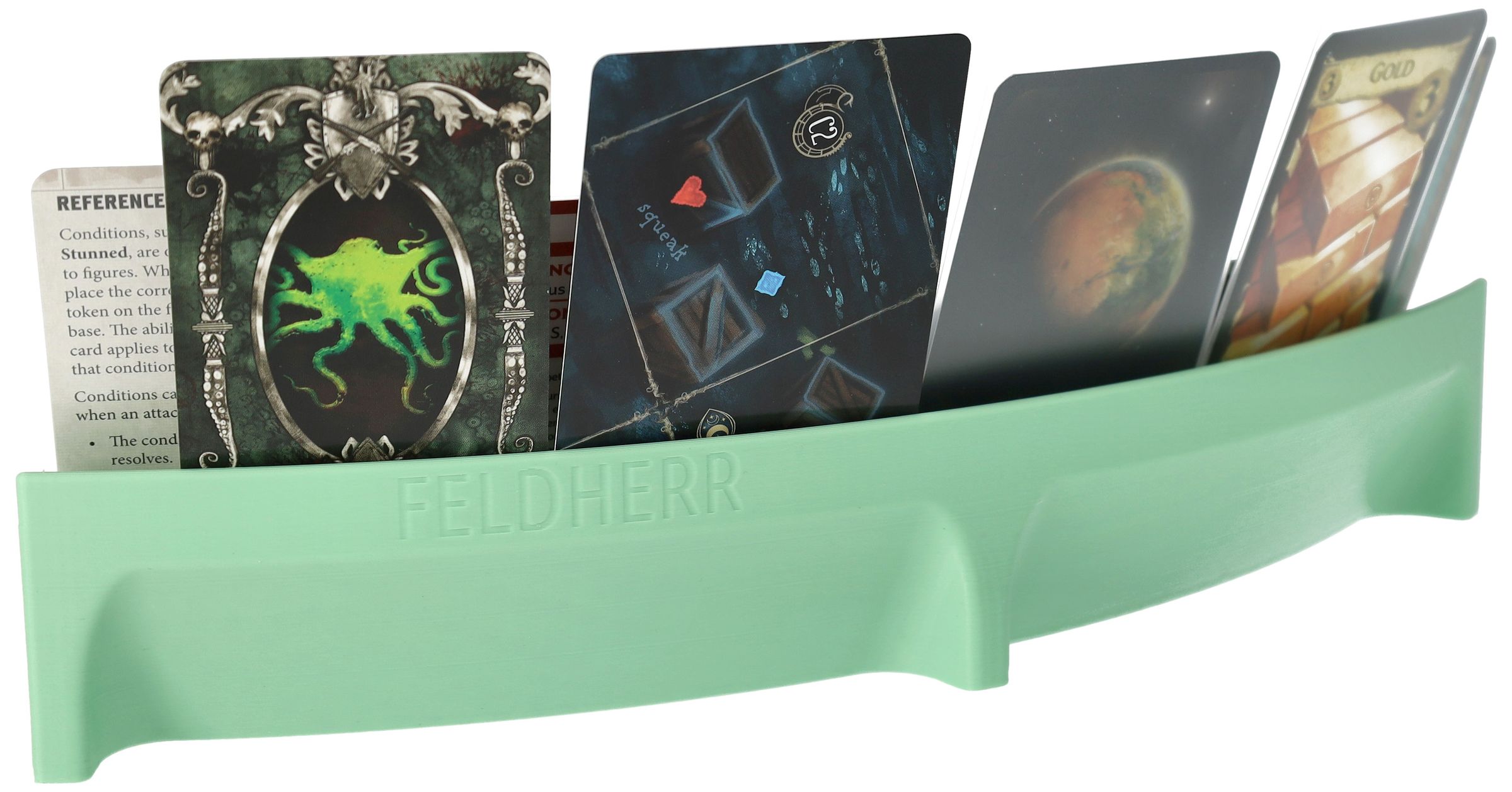 Too many cards in your hand and too little space on the gaming table? With this Feldherr card stand, you have your cards neatly and clearly arranged in front of you - for a relaxed game, a better overview and more space for the essentials.