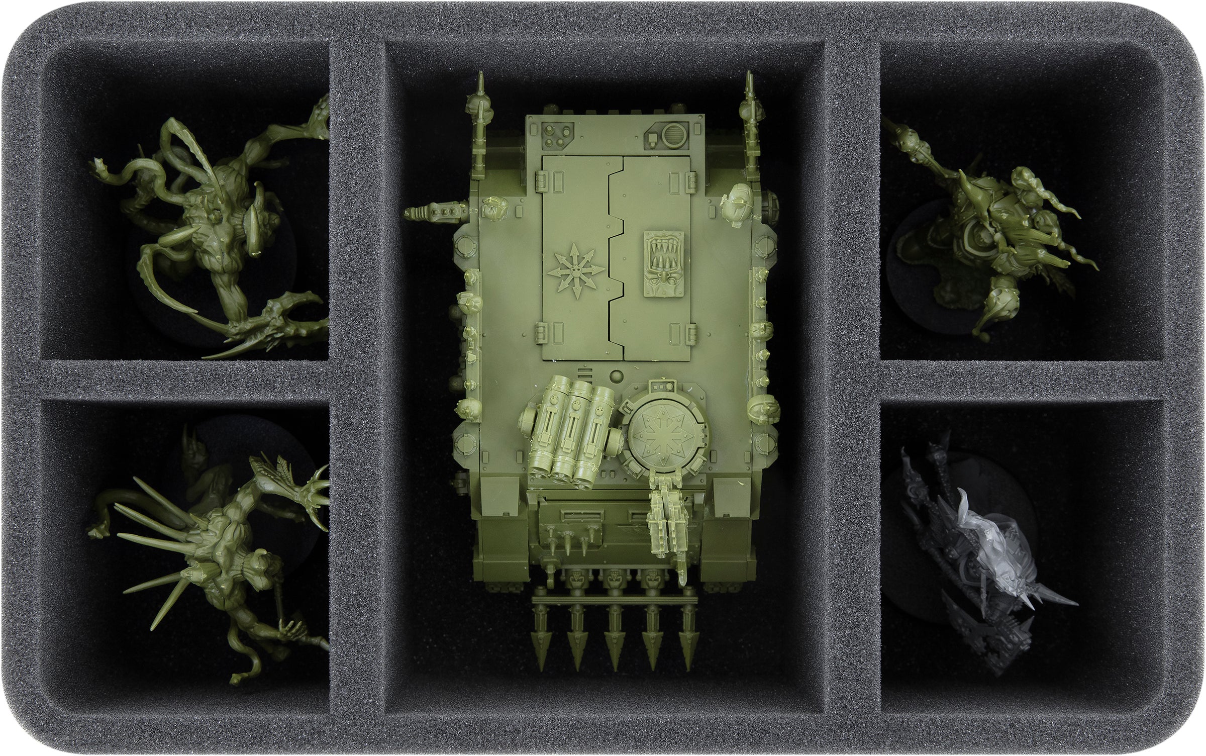- 2 Half-Size foam trays with 5 compartments each for Chaos Space Marine Rhino, Deathshroud Bodyguard, Lord of Virulence, Lord Felthius, the Tainted Cohort and models with similar dimensions (HS090A006)