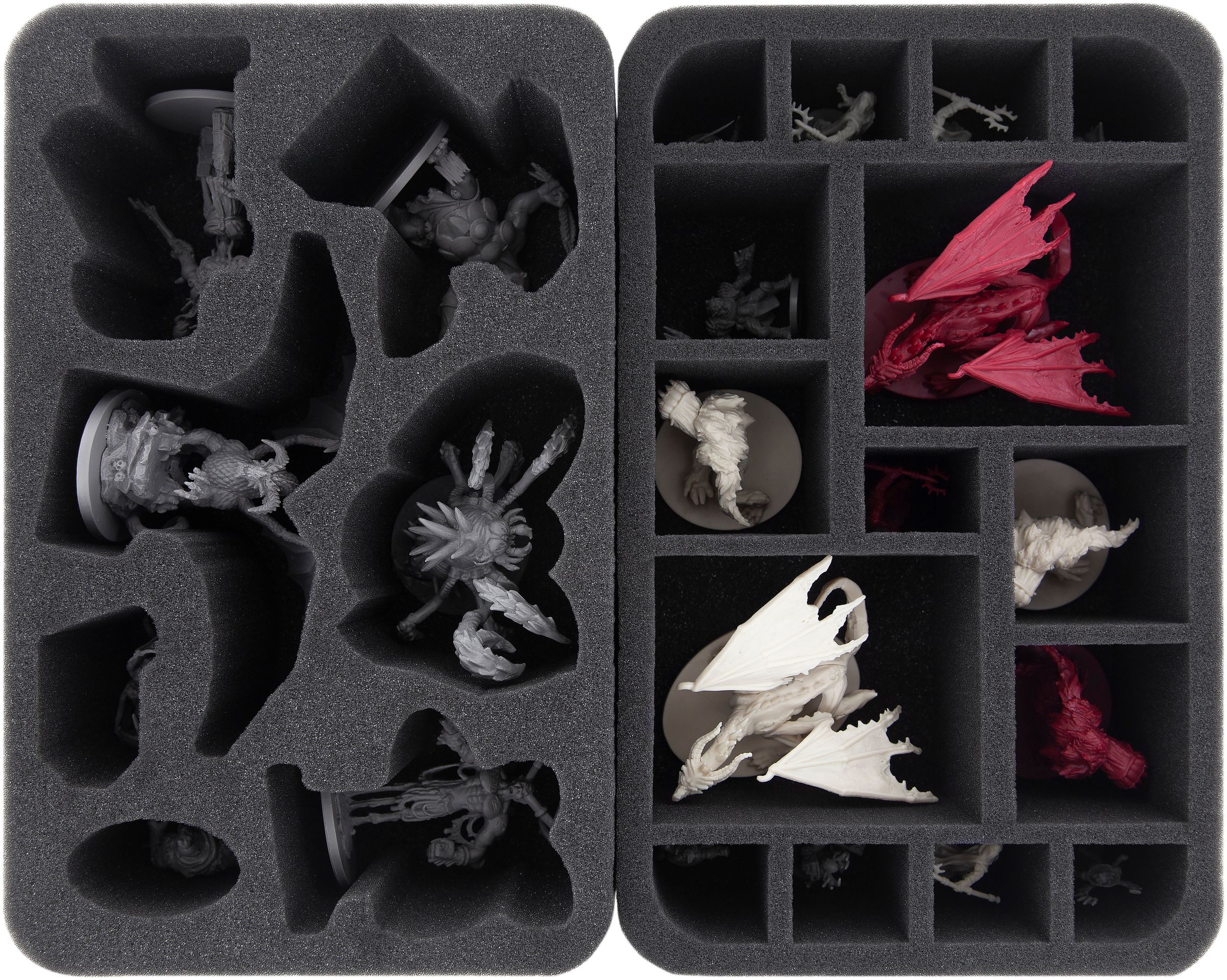 10 custom-fit foam trays ensure that all your hero and monster miniatures are padded softly. From the Shadow Dragons to the Harpies to the Cave Spiders, there is a suitable compartment for every miniature.