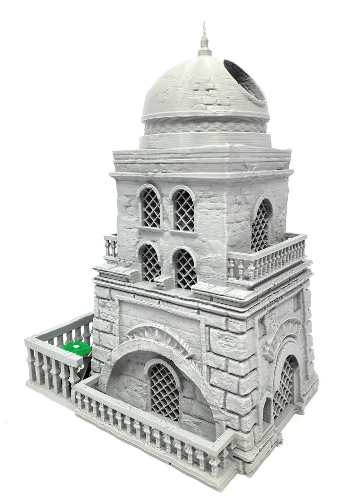 3D printed - detailed dice tower, with removable roof and exchangeable dice tray. The Dice Tower can also be used as a terrain part for your miniatures game or as a center piece for your next DnD session.
