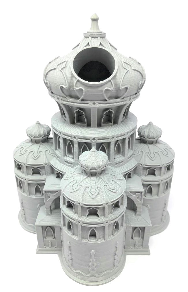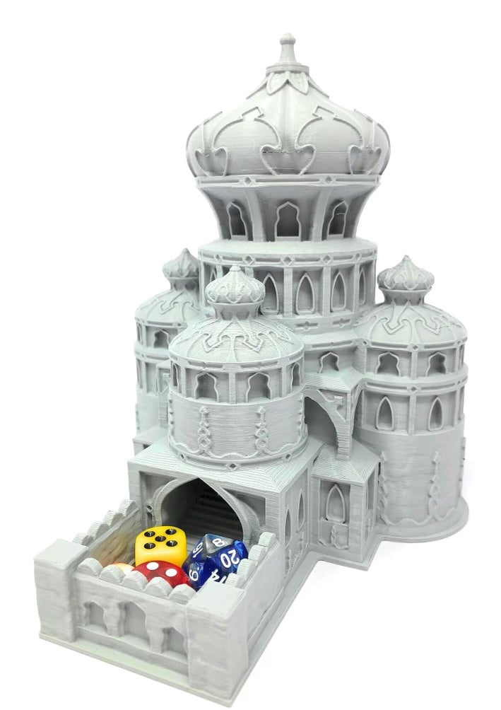 3D printed - detailed dice tower, with removable roof and exchangeable dice tray. The Dice Tower can also be used as a terrain part for your miniatures game or as a center piece for your next DnD session.