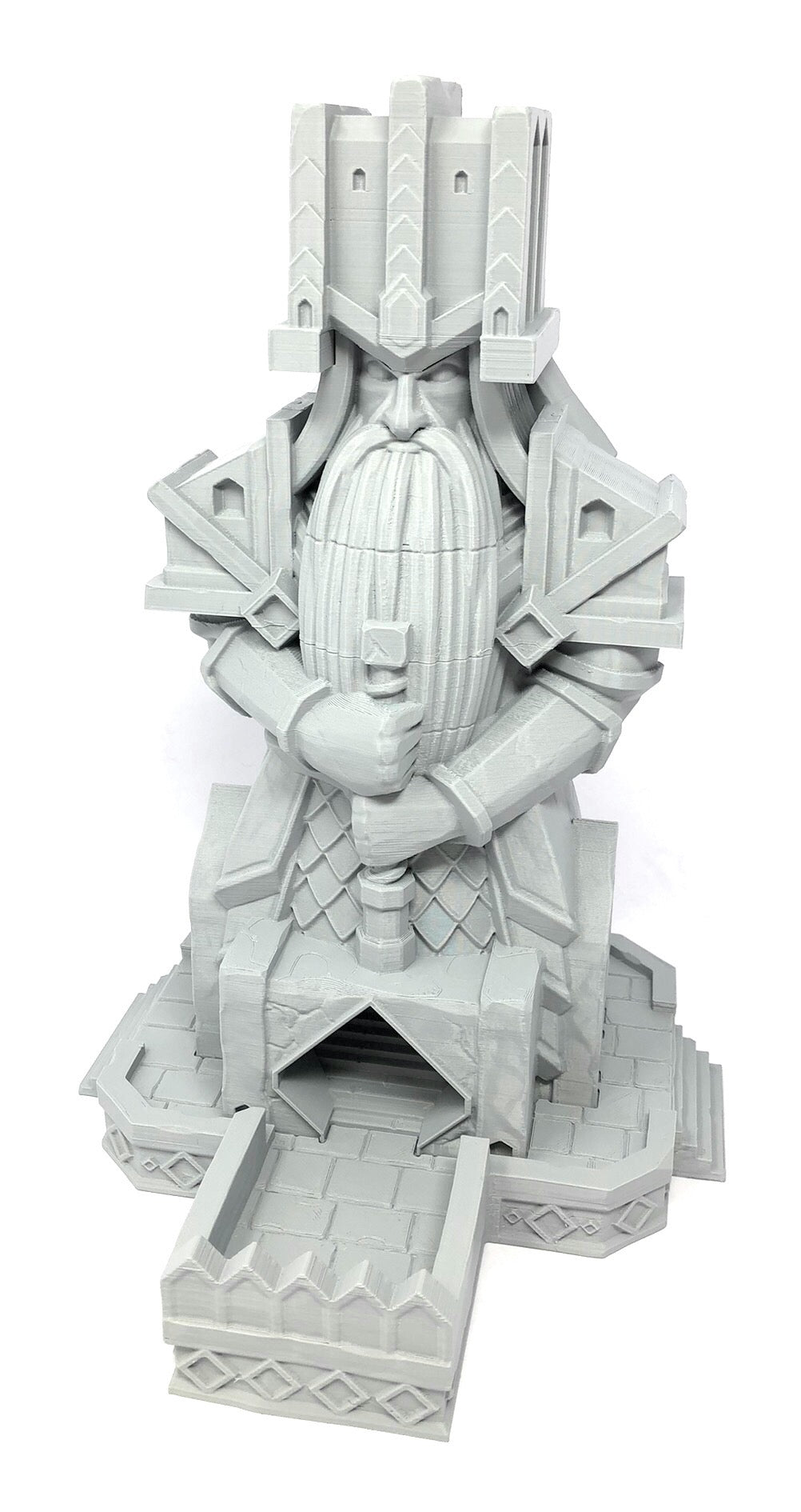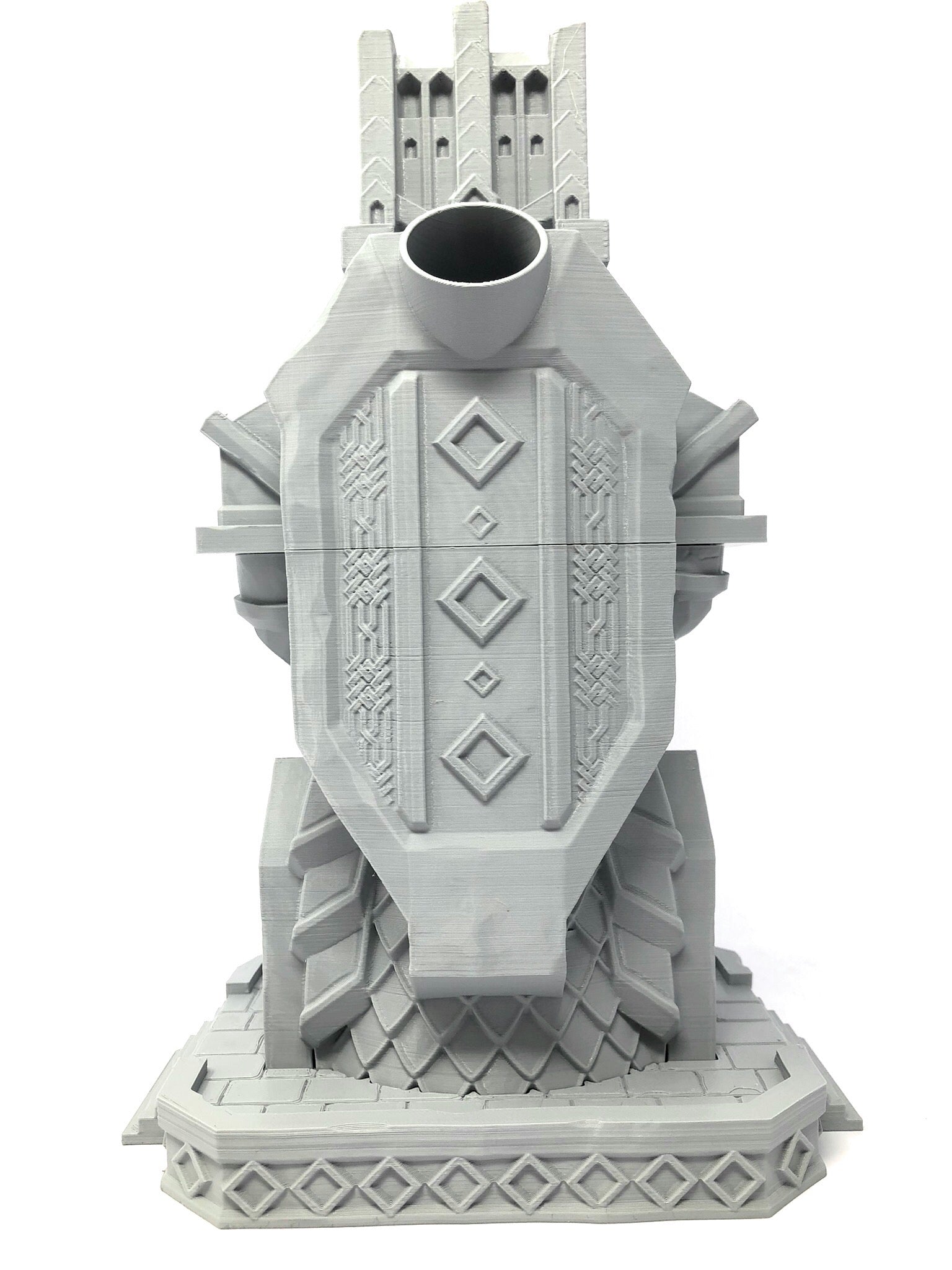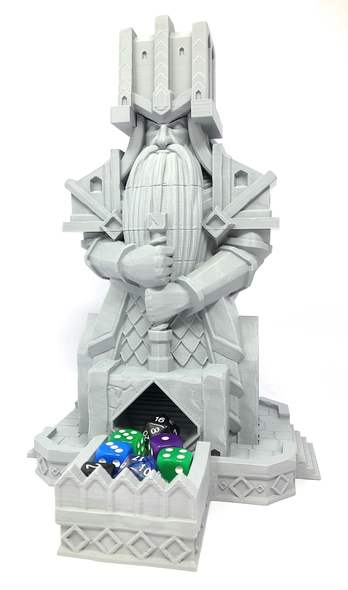 3D printed - detailed dice tower, with removable roof and exchangeable dice tray. The Dice Tower can also be used as a terrain part for your miniatures game or as a center piece for your next DnD session.
