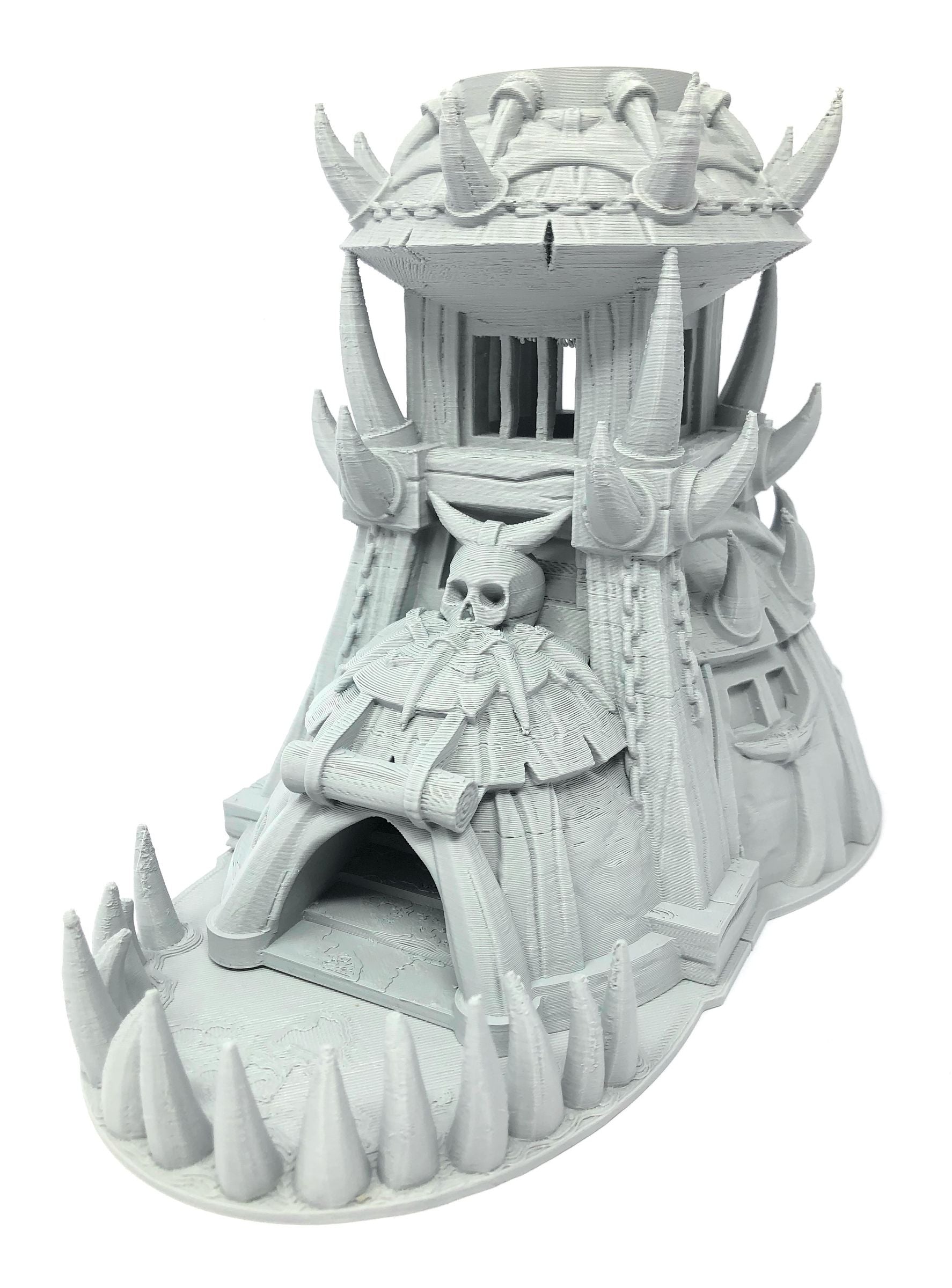 3D printed - detailed dice tower, with removable roof and exchangeable dice tray. The Dice Tower can also be used as a terrain part for your miniatures game or as a center piece for your next DnD session.