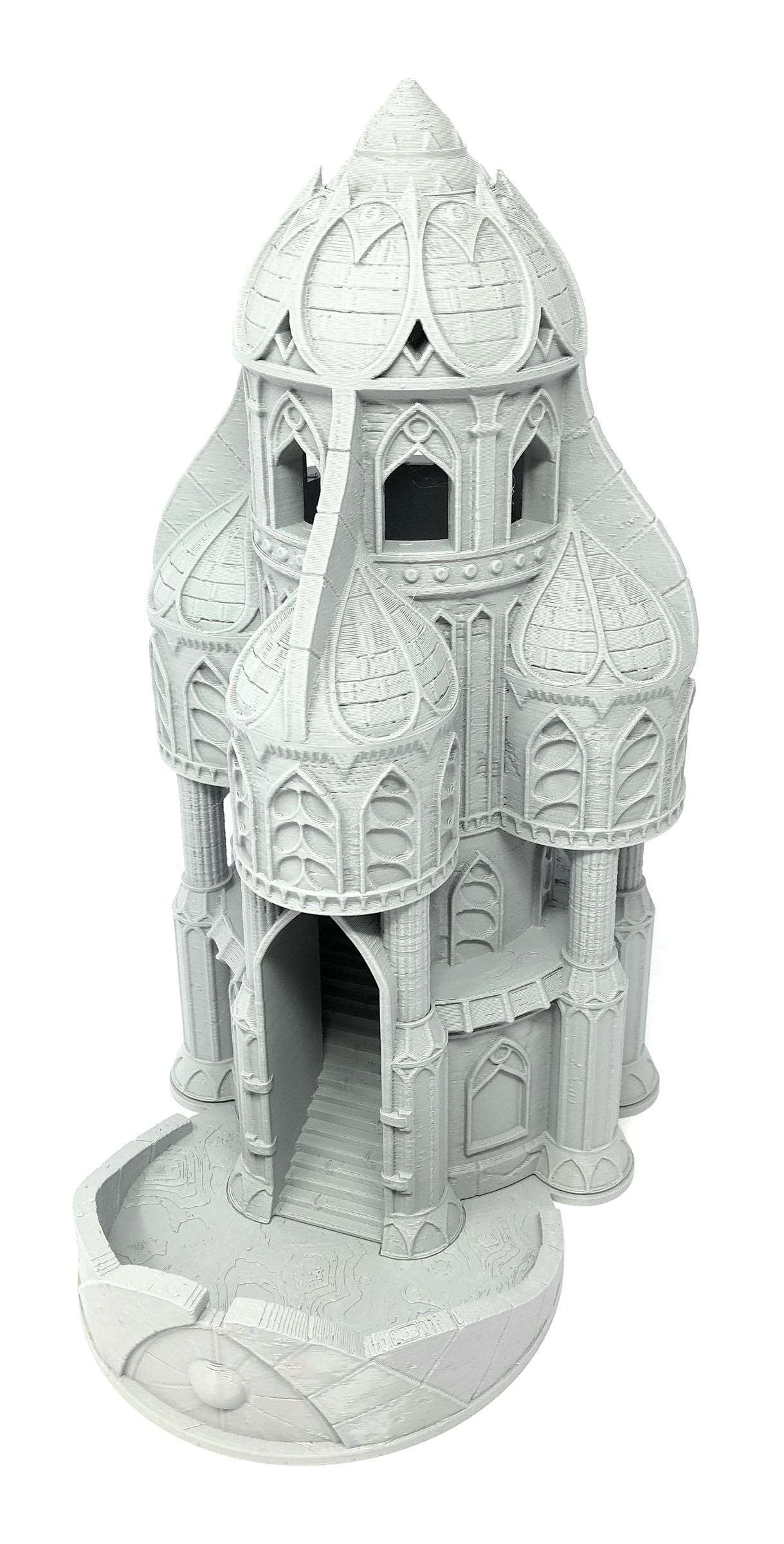 3D printed - detailed dice tower, with removable roof and exchangeable dice tray. The Dice Tower can also be used as a terrain part for your miniatures game or as a center piece for your next DnD session.