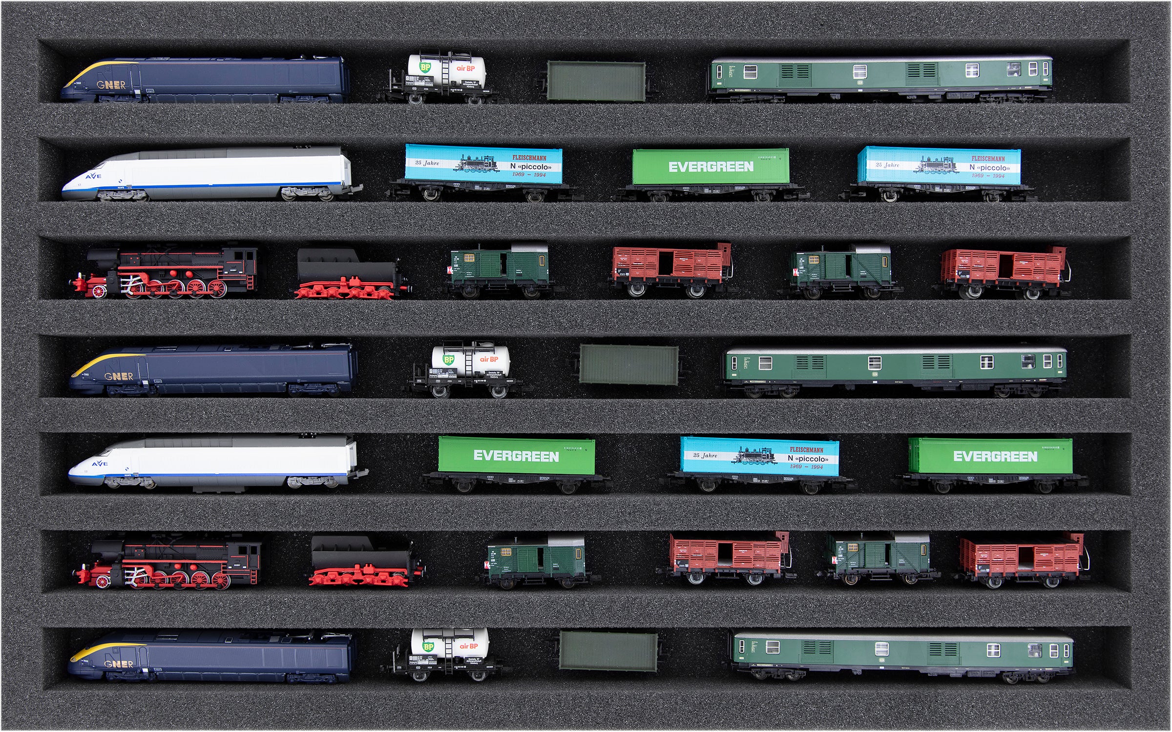 Seven compartments, tailor-made for horizontal storage of model railways in Gauge N, offer your wagons and locomotives reliable protection for storage and transport. Due to the lying position the tray can also be used as a display for the presentation of your model train collection.