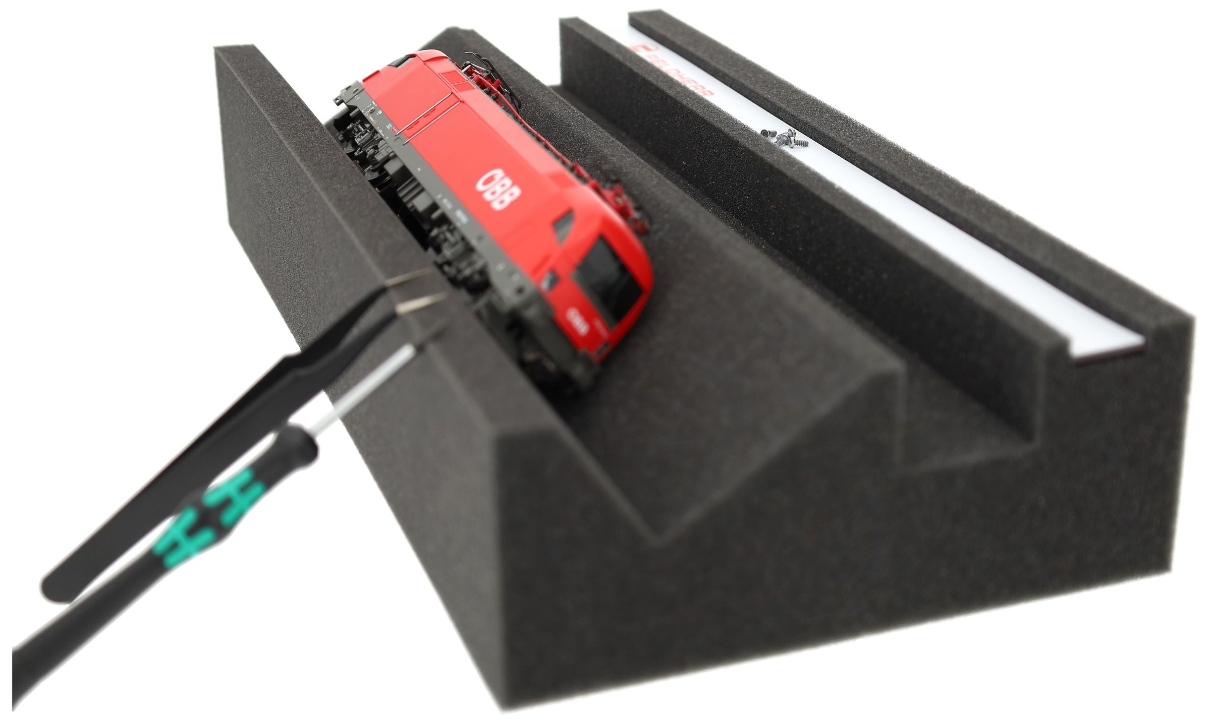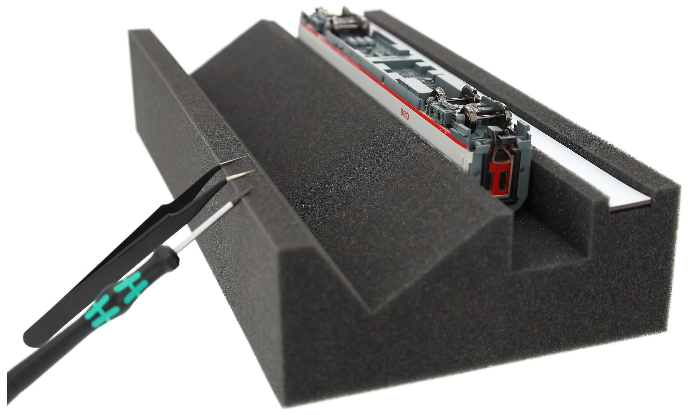 Whether for regular maintenance, repairs, or component replacement on HO models - this loco cradle offers more flexibility and comfort when working with the popular HO scale through the additional maintenance shaft. The innovative combination of magnetic strip and flexible maintenance areas makes it ideal for HO scale model railway enthusiasts who place the highest value on precision and efficiency.