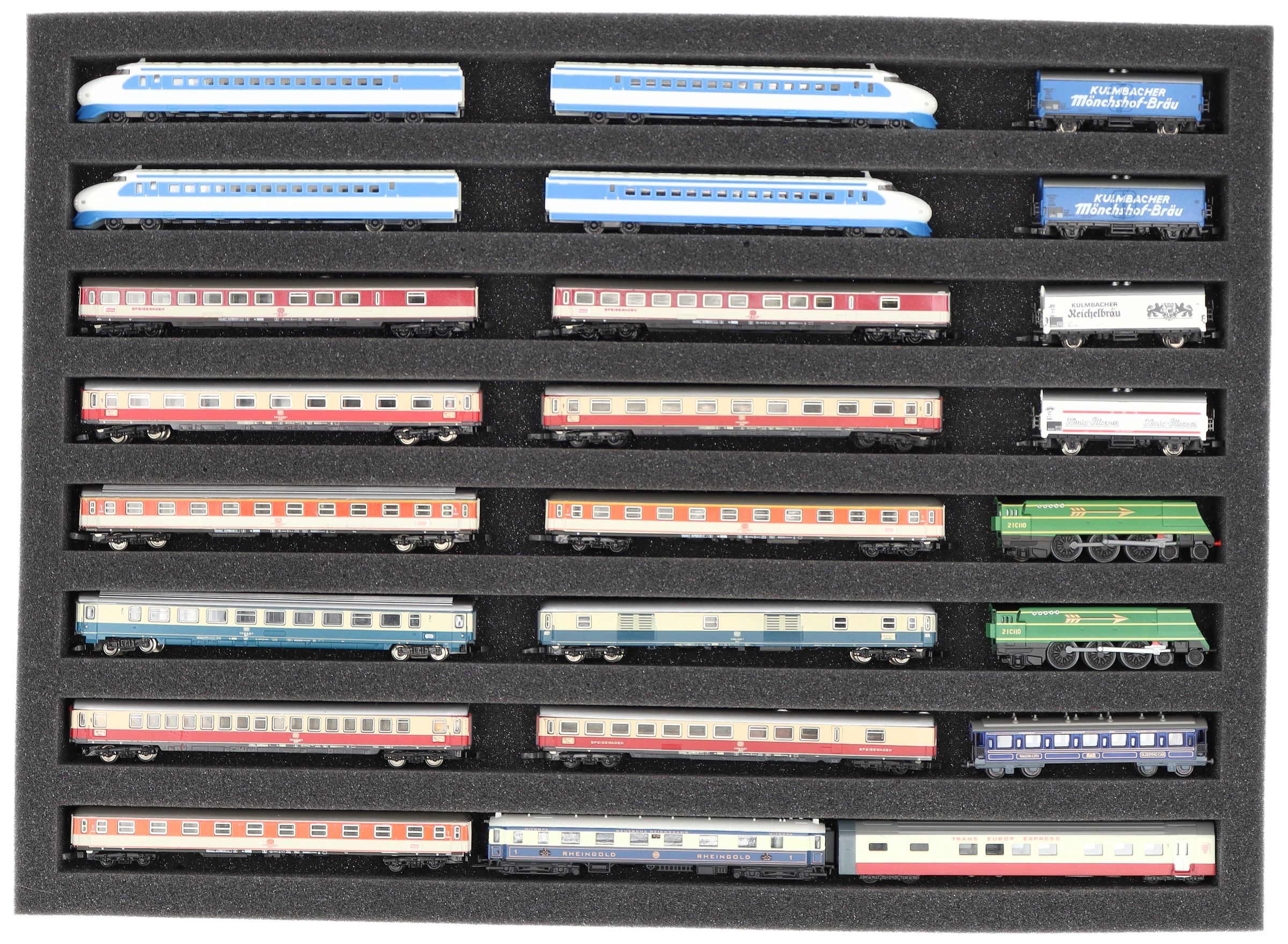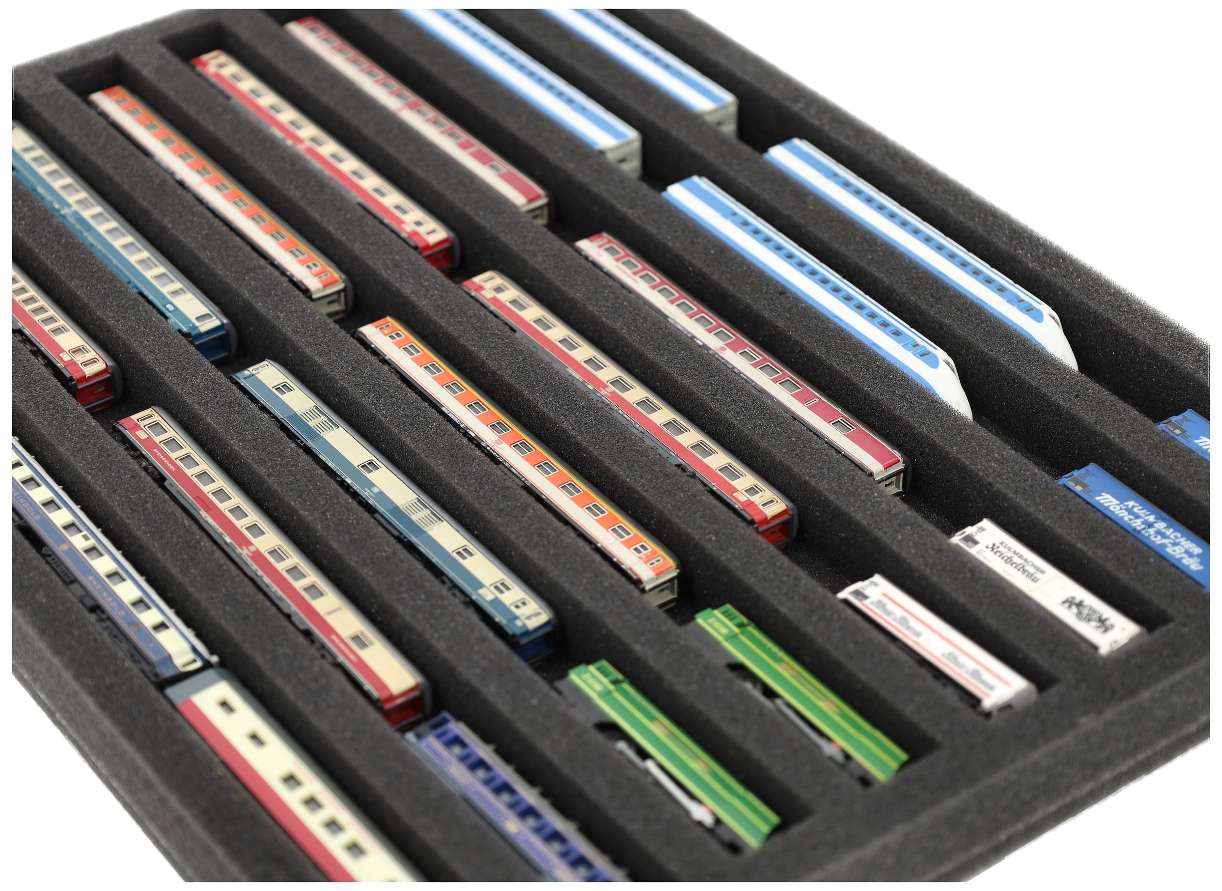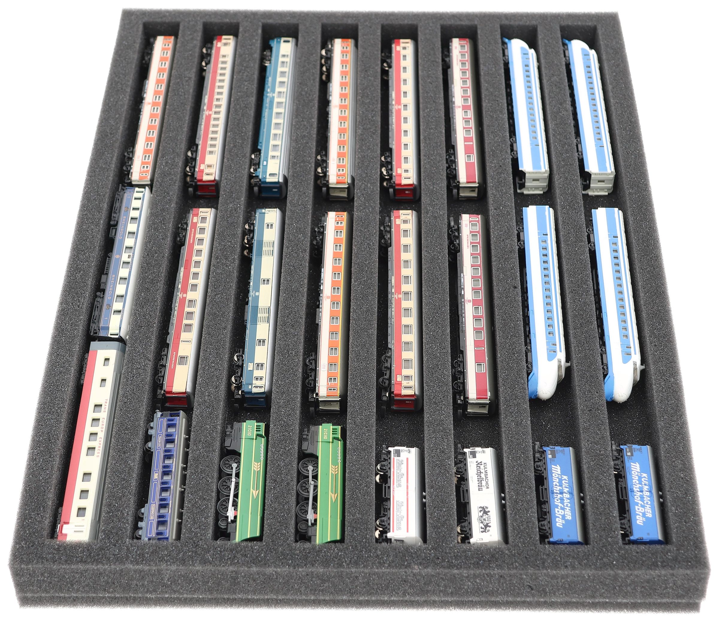 Whether for transport to exhibitions, module meetings, or safe storage on shelves at home, this insert keeps your Z scale locomotives and cars reliably protected. The 8 compartments hold the models horizontally and shield them from bumps and scratches.