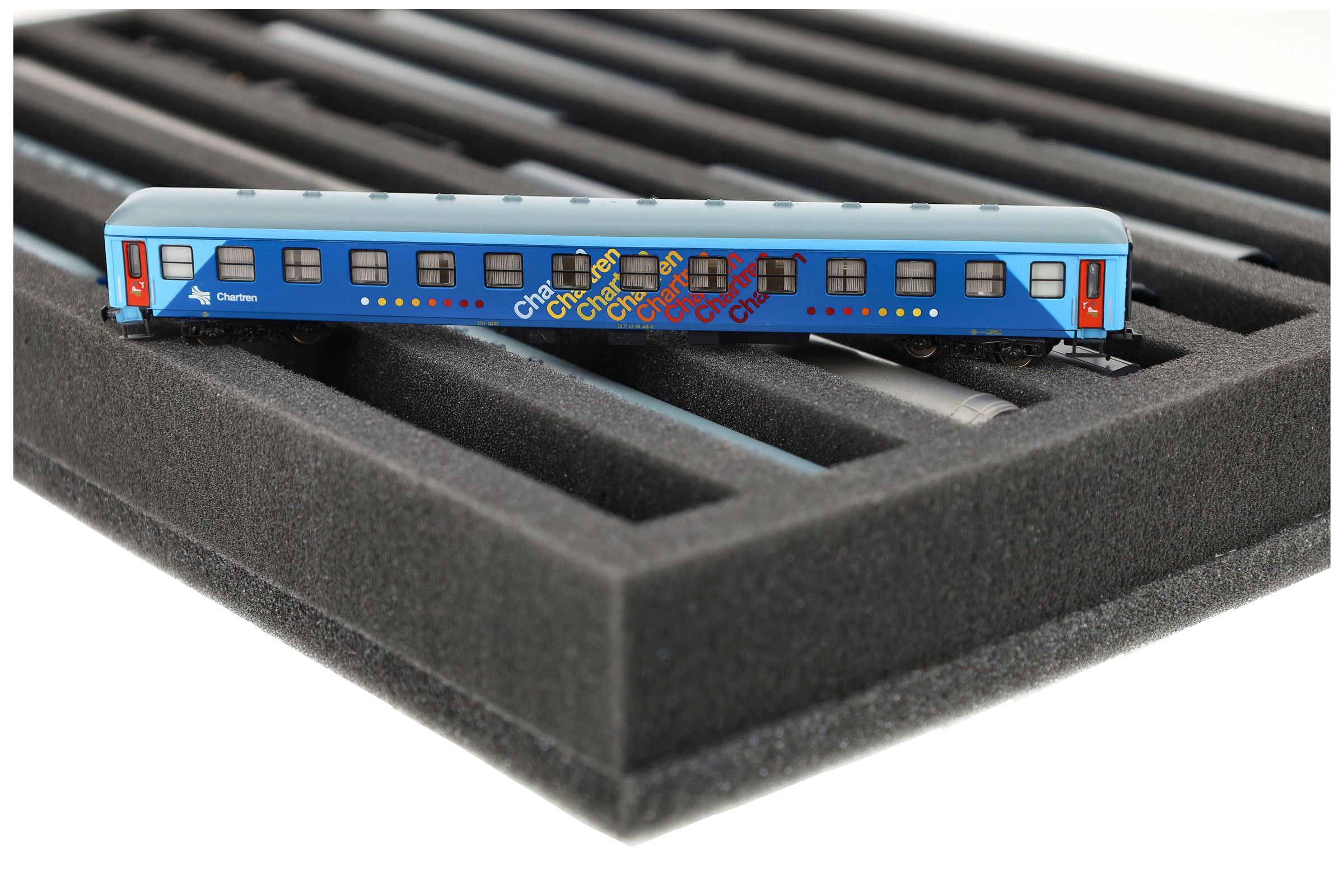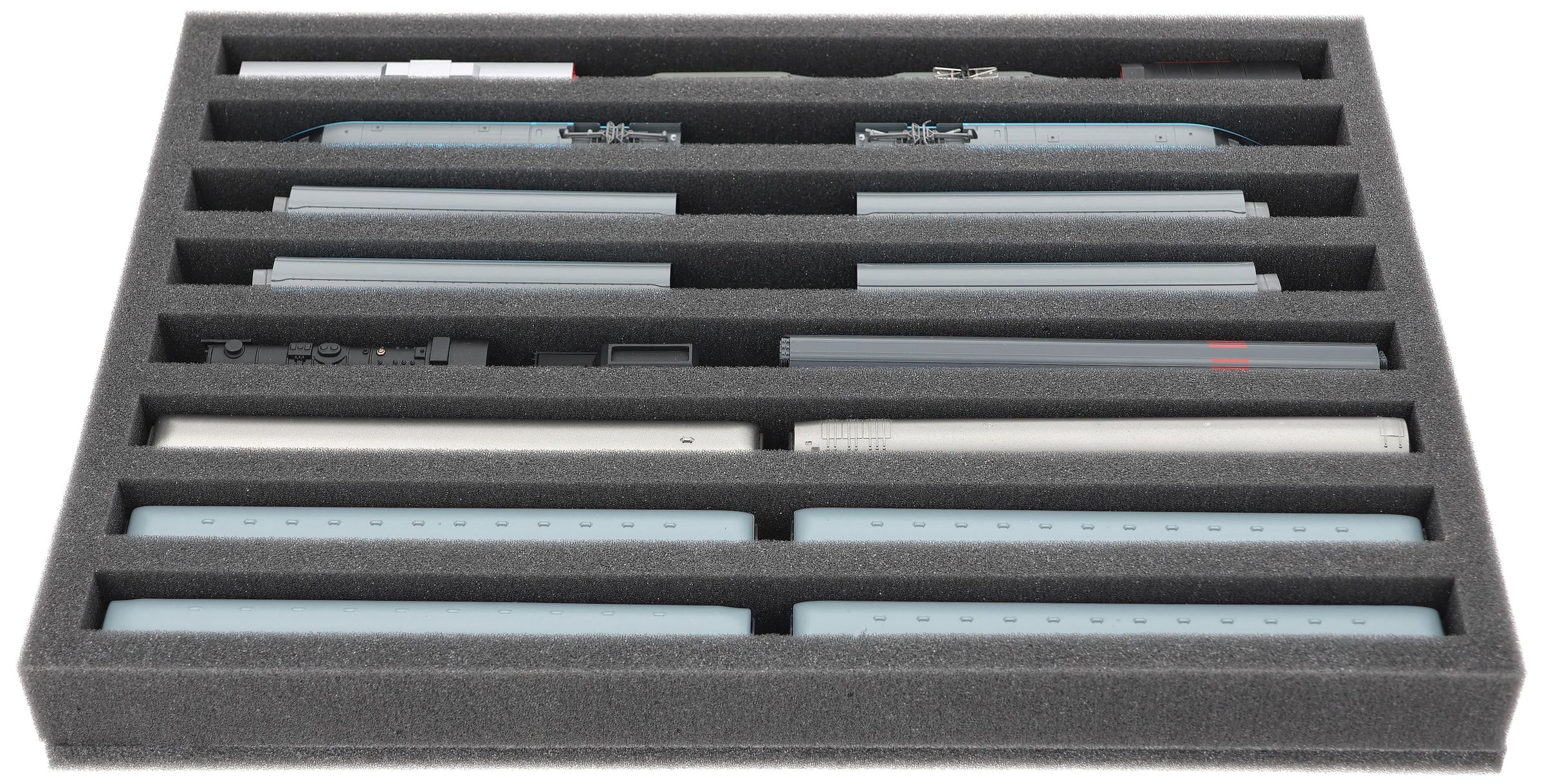 Whether for transport to exhibitions, module meetings, or safe storage on shelves at home, this insert keeps your N scale locomotives and cars reliably protected. The 8 compartments hold the models upright and shield them from bumps and scratches.