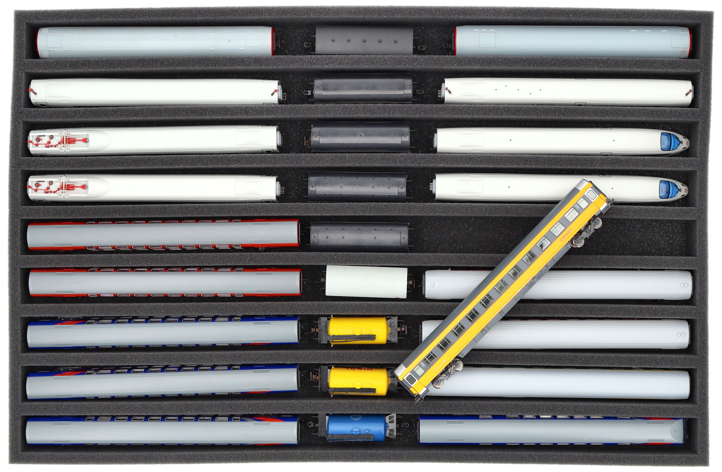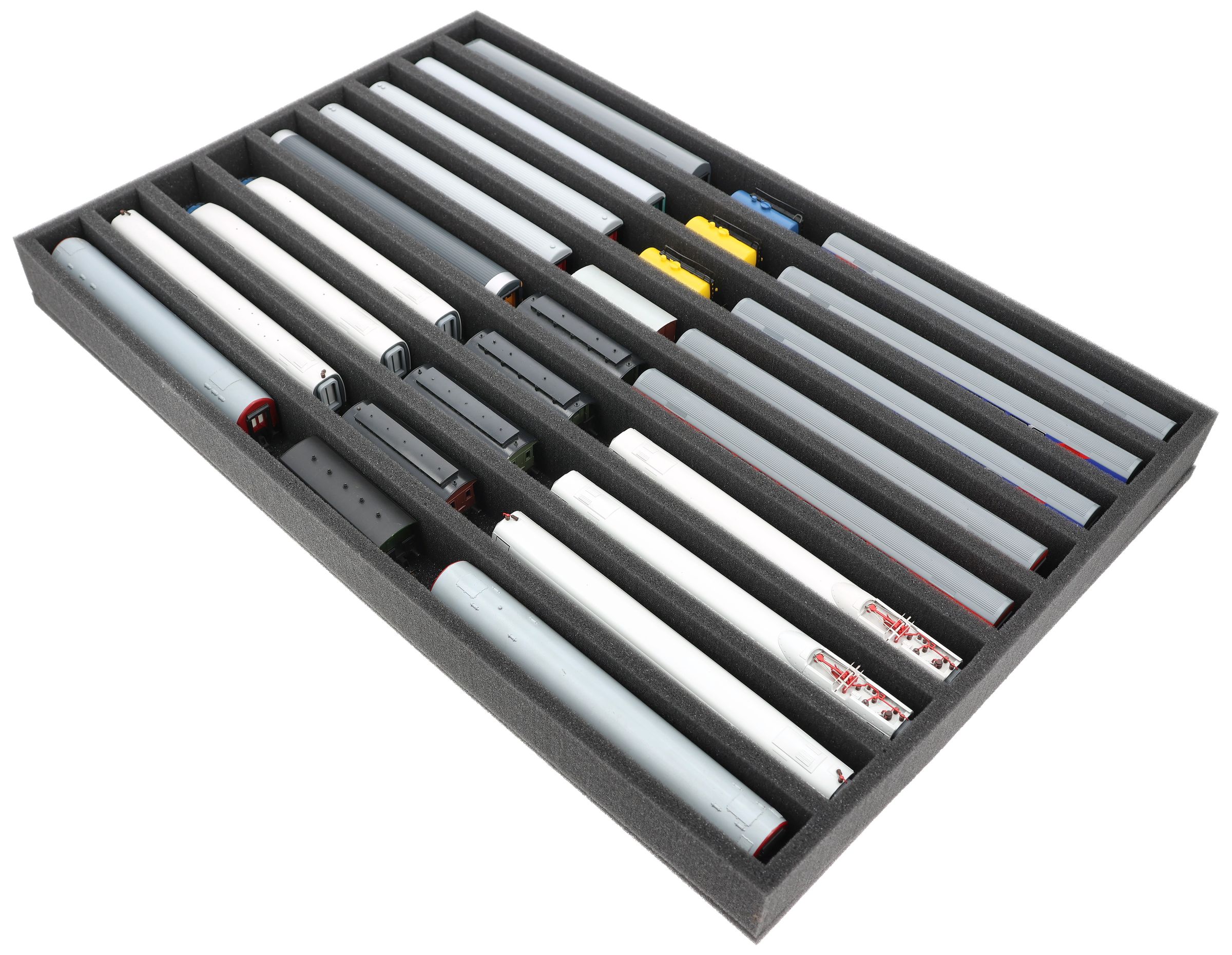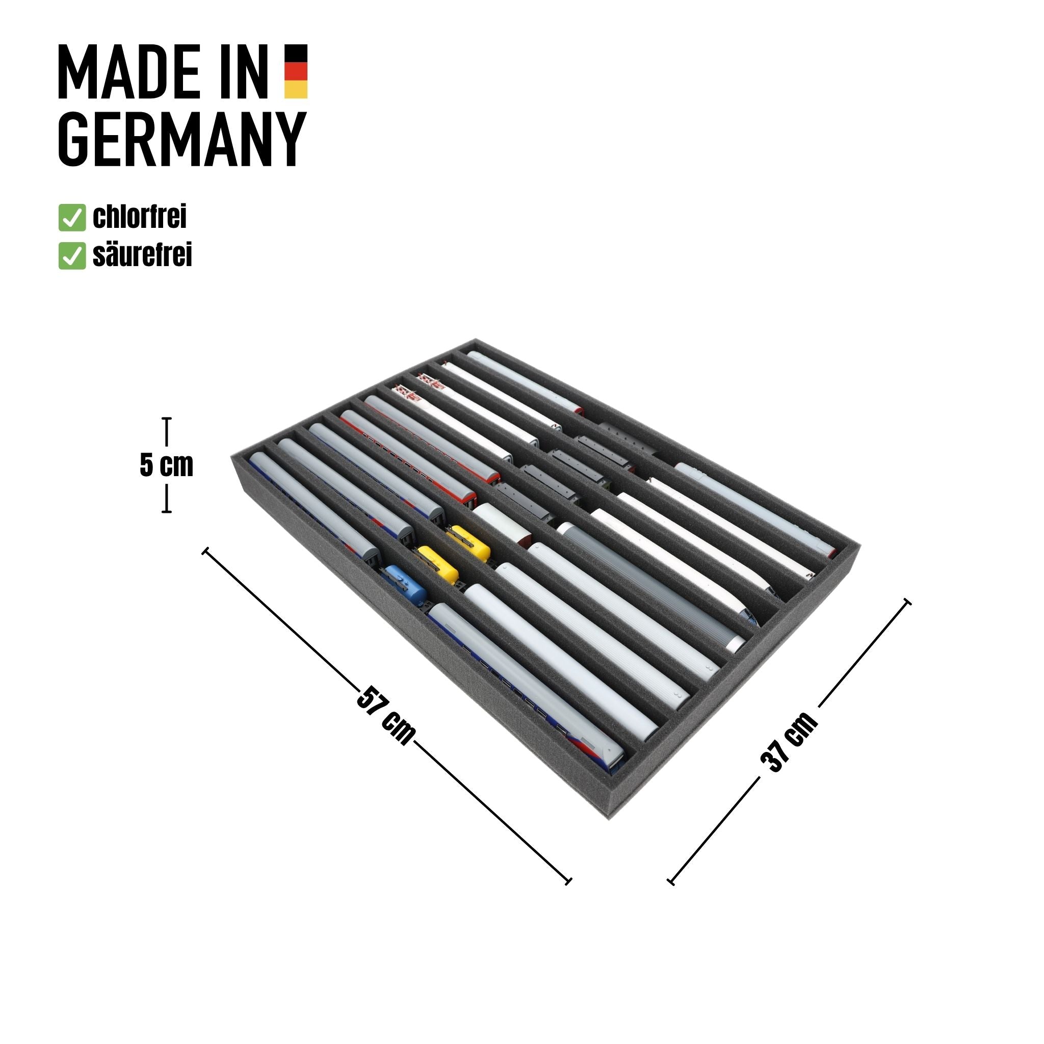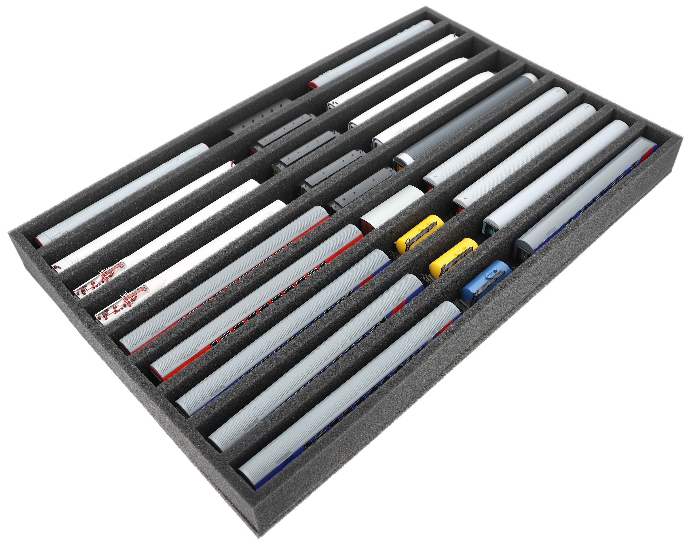 Whether for transport to exhibitions, module meetings, or safe storage on shelves at home, this insert keeps your TT scale locomotives and cars reliably protected. The 9 compartments hold the models upright and shield them from bumps and scratches.
