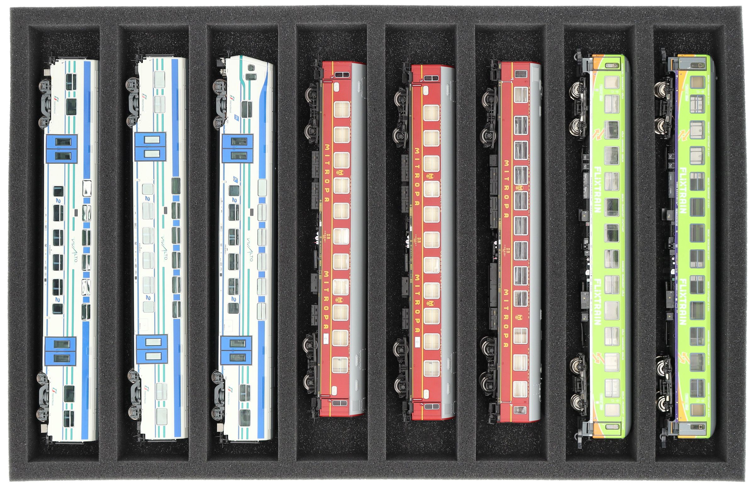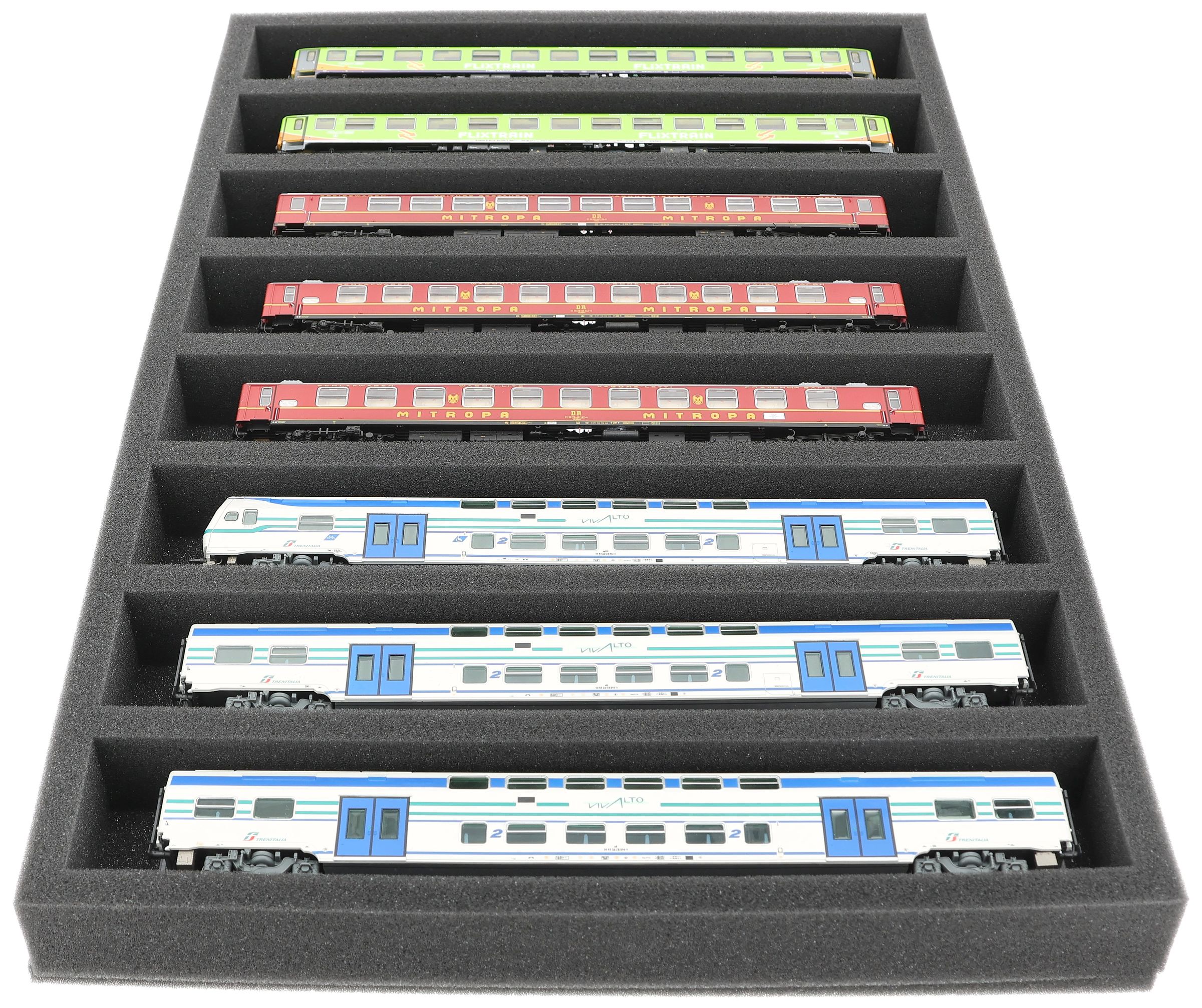 Whether for transport to exhibitions, module meetings, or safe storage on shelves at home, this insert keeps your H0 scale locomotives and cars reliably protected. The 8 compartments hold the models horizontal and shield them from bumps and scratches.