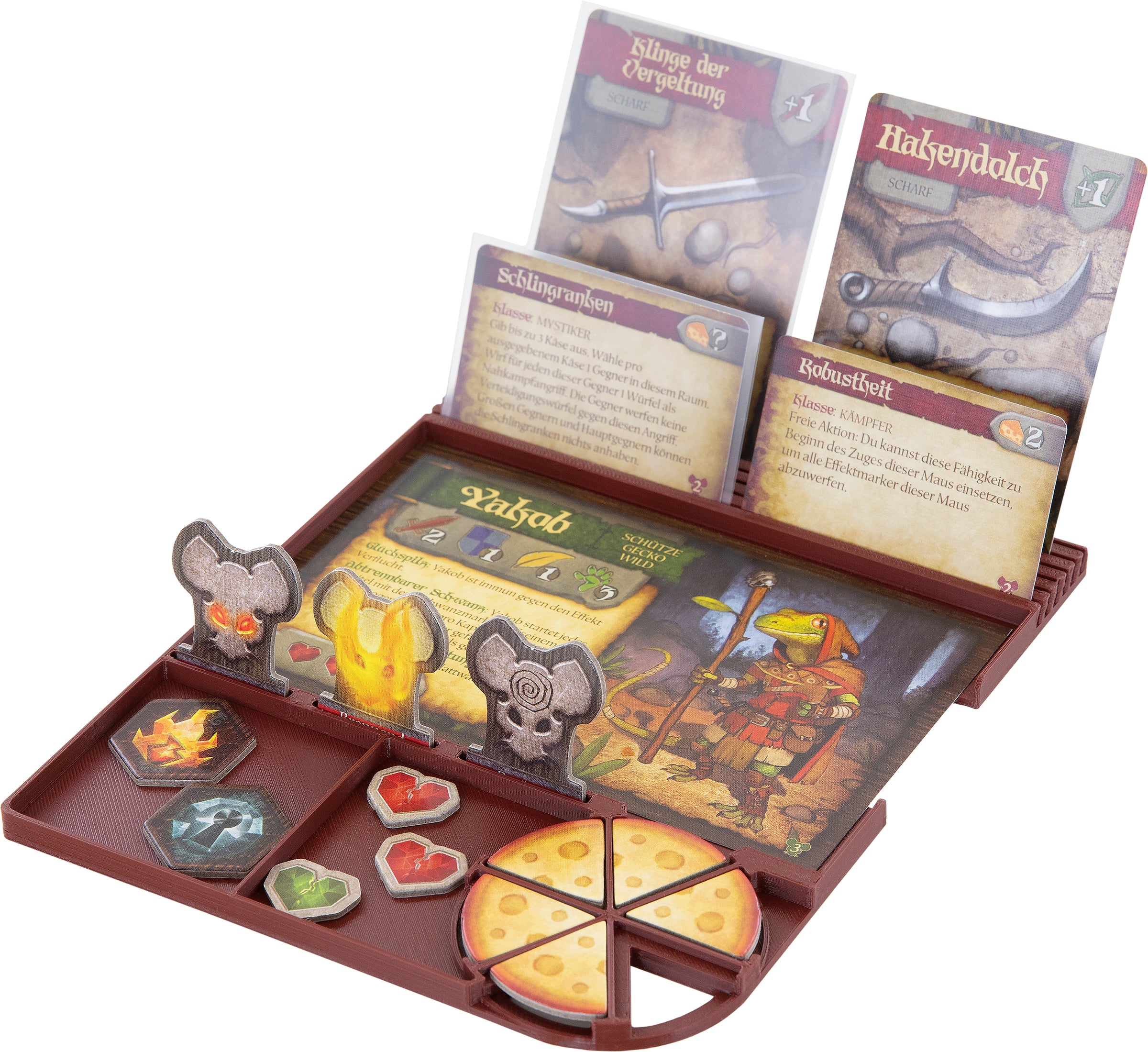 Cheese chunks, Mousetraps, Wound tokens, Action dice, and lots of cards obscure your view? So that you and your fellowship don't end up as snacks between the fangs of the household cat, we've put together for you this value pack of 4 hero dashboards for "Mice and Mystics". The boards keep the tabletop tidy, and you make the charakter management of your rodent heroes easy as never before. And most importantly, everyone gets their own piece of cheese.