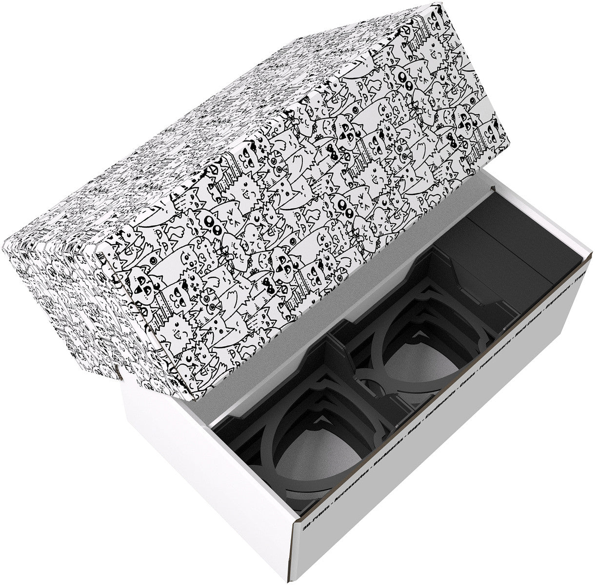 The Storage Box comprises two parts, box and lid. Both parts are made of coated cardboard. A partition in the middle of the box divides it into two equally sized compartments. The slip-on lid protects the cards from dust and other external influences.