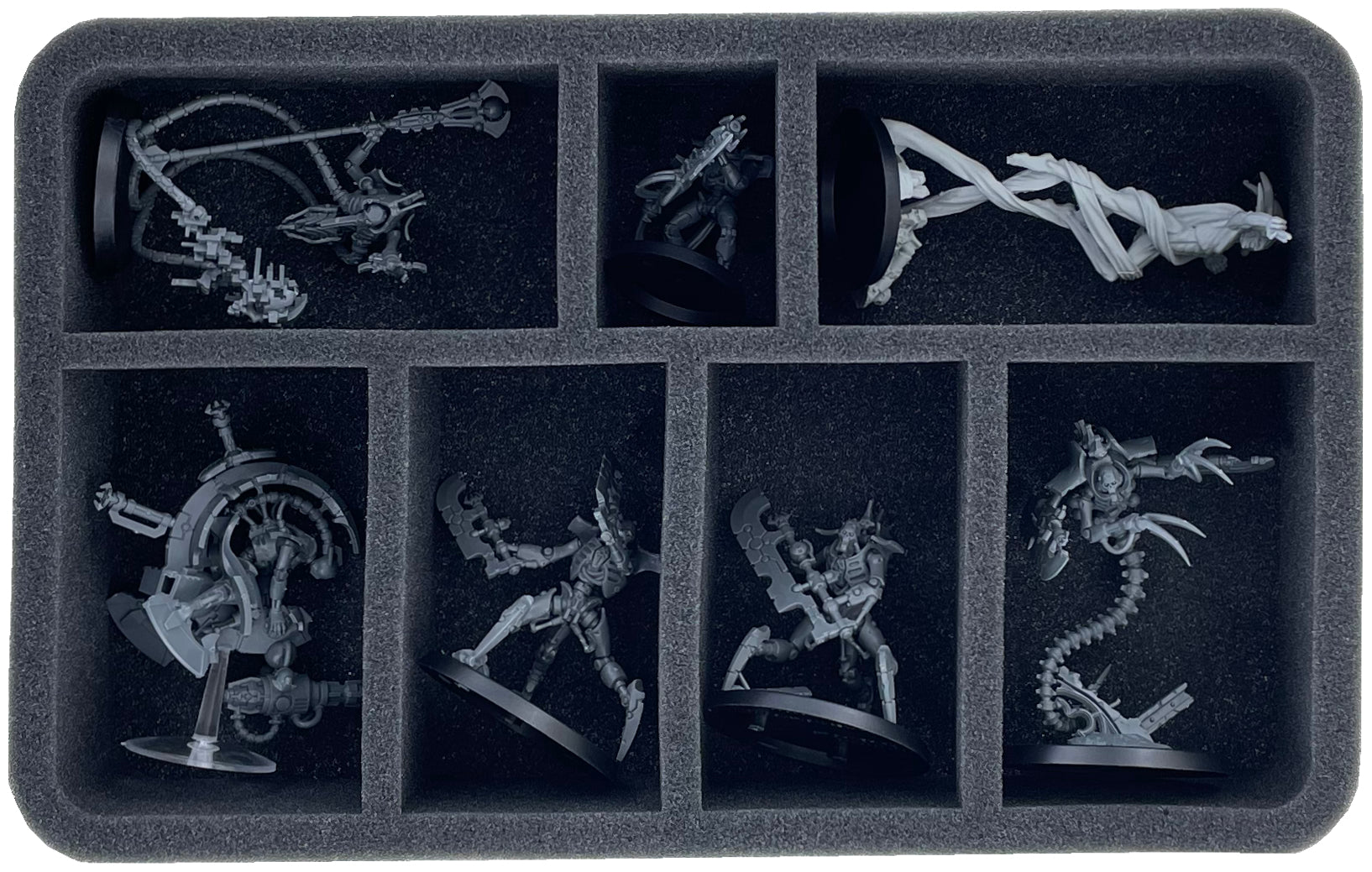 - 1 Half-Size foam tray with 7 compartments for Ophydian Destroyers, Scarab Swarms and Canoptek Plasmacyte (HS055A006)